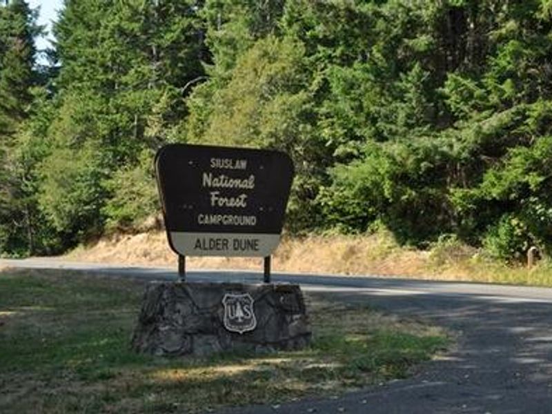 Alder Dune Campground sits in a lush coastal forest between Alder and Dune Lakes in western Oregon's Siuslaw National Forest. The campground features 39 campsites with privacy created by walls of native shrubbery, with the day-use area nearest to Dune Lake and the northern loop running along Alder Lake. Paved roads make the campground easily accessible. The quiet ambiance at the campground is ideal for wildlife viewing. Both Alder and Dune Lakes are stocked with rainbow trout several times a year, providing excellent fishing opportunities. A trail system starting at the Alder Dune Day Use Area leads guests through an easy to moderate journey around Alder Lake and over sand dunes, where it connects to Sutton Trail and heads to Pacific Coast beaches. Heceta Beach is located nearby, giving visitors additional opportunities to enjoy the Pacific Ocean. The campground sits in the Siuslaw National Forest, one of two forests in the continental United States bordering the Pacific Ocean. Thick Douglas fir forests contrast sharply with miles of open sand dunes, beaches and freshwater lakes, creating a unique coastal environment.