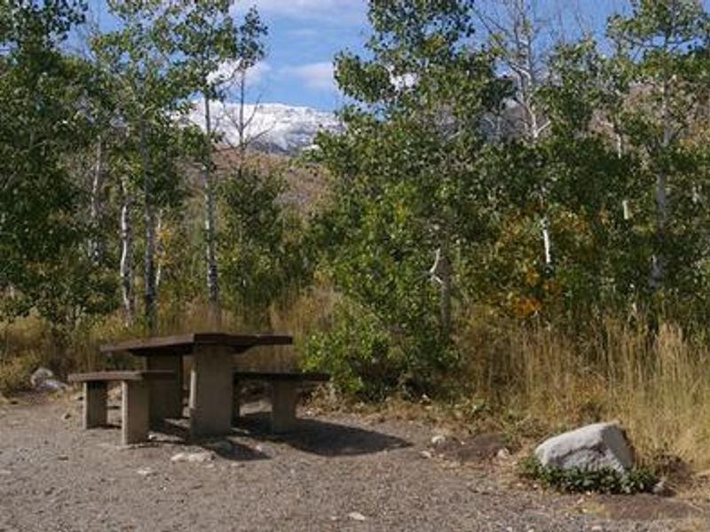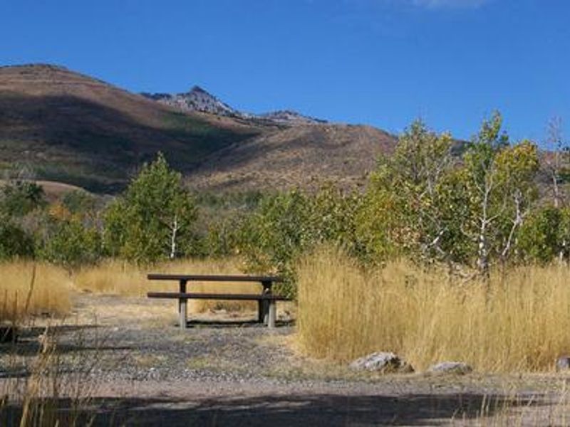 Angel Creek Campground is nestled in the grassy foothills of the East Humboldt Mountain Range at 6,500 feet elevation, just eight miles southwest of Wells, Nevada. The campground sits among mature aspen groves that provide partial shade and spectacular fall color displays, with wildflowers dotting the landscape throughout the summer months. Angel Lake, located just four miles from the campground, is a major draw for visitors seeking canoeing and fishing opportunities for rainbow and brook trout. The Smith Lake Trail begins at the campground entrance with designated day-use parking, providing access to the northern portion of the East Humboldt Wilderness. The area is home to diverse wildlife including bighorn sheep, mountain goats, deer, and various birds of prey, offering excellent viewing opportunities. The campground features a mix of reservable and first-come, first-served sites, including individual campsites and a group tent site that can accommodate up to 30 people and six tents with parking for six vehicles. Standard amenities include vault toilets, potable water during peak season, picnic tables, fire rings, and trash collection. Sites are priced at $17 per night for single sites and $34 per night for double sites, with a 50% discount available for Interagency Senior/Access Pass holders on single sites only.