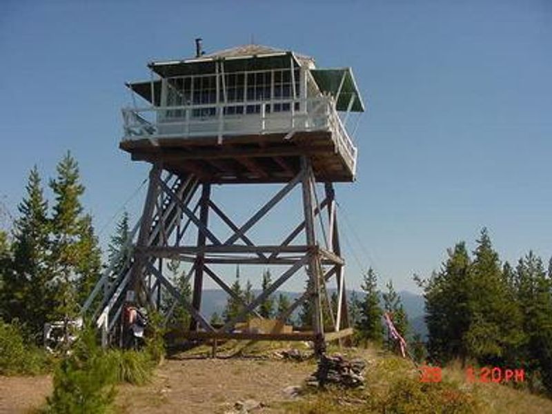 Built in 1934 to detect fires sparked by the Milwaukee Railroad Line, Arid Peak Lookout was last staffed in 1969 and sat idle for over 25 years. Through the efforts of over 30 volunteers, the Forest Fire Lookout Association, and the U.S. Forest Service, it was restored to its original condition in 1997 and is now listed on the National Register of Historic Lookouts. The lookout sits atop a 20-foot tower at 5,306 feet elevation, providing epic 360-degree views of the Bitterroot Mountains and overlooking the scenic Loop Creek area. The cabin accommodates up to four guests and includes two cots with mattresses, basic cooking gear, dishes, a propane camp stove, propane lantern, water containers, a table with two chairs, and a wood stove for heat. An outhouse is located outside the tower. No water is available on-site, so guests must bring their own or treat and boil water from nearby springs. The lookout offers access to three excellent trails: Arid Peak Trail #173, Mozier Peak Trail #174, and Kyle Creek Trail #175, all suitable for day hiking, backpacking, or horseback riding. The famous Hiawatha Bicycle Trail, considered the crown jewel of rail-to-trail mountain biking routes, can be accessed just over 10 miles from the lookout.