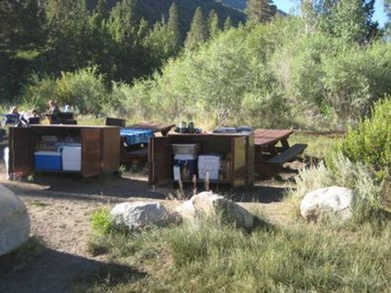 Aspen Group Campground is a primitive group camping area situated along the cascading Rock Creek in Inyo National Forest, between Mammoth Lakes and Bishop. At an elevation of 8,100 feet, the campground sits in a stand of rustling aspen trees that shimmer golden in fall, with views of massive peaks to the west and surrounding steep canyons. The group site is adjacent to Rock Creek, which originates in the John Muir Wilderness and runs for 22 miles through Rock Creek Canyon. The area provides exceptional trout fishing, with Rock Creek known for brook, brown, rainbow, and stocked Alpers trout. Golden trout may be caught in the backcountry. Hikers can explore trails that meander around high-elevation alpine lakes, while mountain bikers enjoy non-wilderness trails ranging from easy to challenging throughout Rock Creek Canyon. The campground offers wide-open spaces and group picnic areas, making it ideal for large parties and family functions. Wildlife is abundant in the area, including black bear, mountain lions, mule deer, pine martin, marmot, and many species of fish and birds. A commercial pack station is nearby for horseback riding adventures, and several general stores, restaurants, and pay showers are available at nearby resorts.