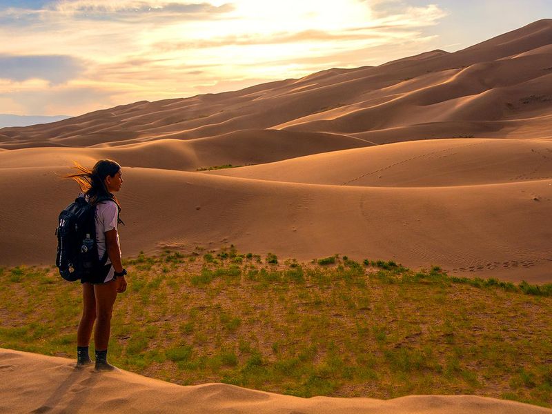 Backpacking at Great Sand Dunes National Park offers two distinct wilderness experiences. The most popular option is camping in the 30-square-mile dunefield, where 20 non-designated sites are available beyond the major dune ridgeline, requiring a minimum 1.5-mile hike over soft sand. Campers enjoy wide open views of starry skies and unique moonlit nights on North America's tallest dunes. Alternatively, 7 designated sites along the Sand Ramp Trail provide a forested experience in mixed conifer habitat at the base of the Sangre de Cristo Mountains with views of the dunes. All backpacking requires an advance permit through Recreation.gov ($6 fee). Maximum group size is 6 people with 2 vehicles per permit. Gas stoves only; campfires prohibited except in the metal fire ring at Sand Creek site. Sand stakes or sandbags essential for securing tents due to frequent high winds. Summer sand surface temperatures can reach 150°F. Water sources are seasonal; bring at least 1 gallon per person per night. Dogs not permitted in dunes backcountry.