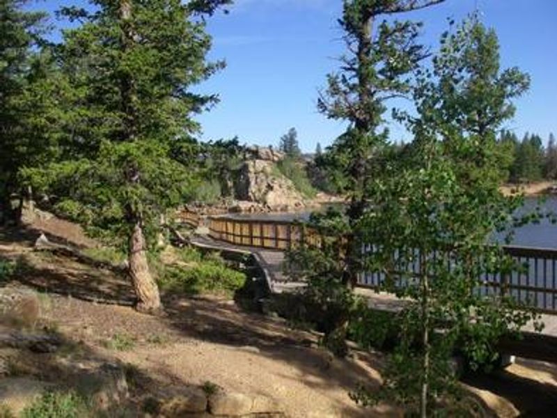 Bellaire Lake Campground is situated at 8,600 feet in the popular Red Feather Lakes area of Roosevelt National Forest, approximately 47 miles northwest of Fort Collins. The campground offers 26 developed sites, including 21 sites with electric hookups and 5 tent-only sites without hookups. Single sites accommodate up to 8 people, while double and triple sites can hold larger groups. Each site features a tent pad, picnic table, campfire ring with grill, and bear locker. The campground is within walking distance of 10-acre Bellaire Lake via a wheelchair-accessible boardwalk. The no-wake lake is popular for canoeing and fishing, with anglers targeting rainbow and brook trout. The surrounding area offers numerous recreational opportunities, including the 1.25-mile Molly Lake Trail, 4-mile Mount Margaret Trail, and several off-road vehicle trails within five miles. Additional fishing lakes including Dowdy and West Lakes are nearby. The landscape features rolling hills, pine forests, and distinctive rock formations. Due to mountain pine beetle infestation and hazardous tree removal, many sites have limited shade. The small village of Red Feather Lakes is close by, offering limited dining, general stores, and other services. Afternoon thunderstorms are common during spring and summer months.