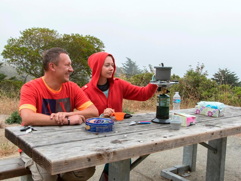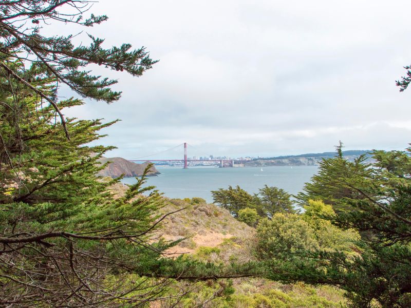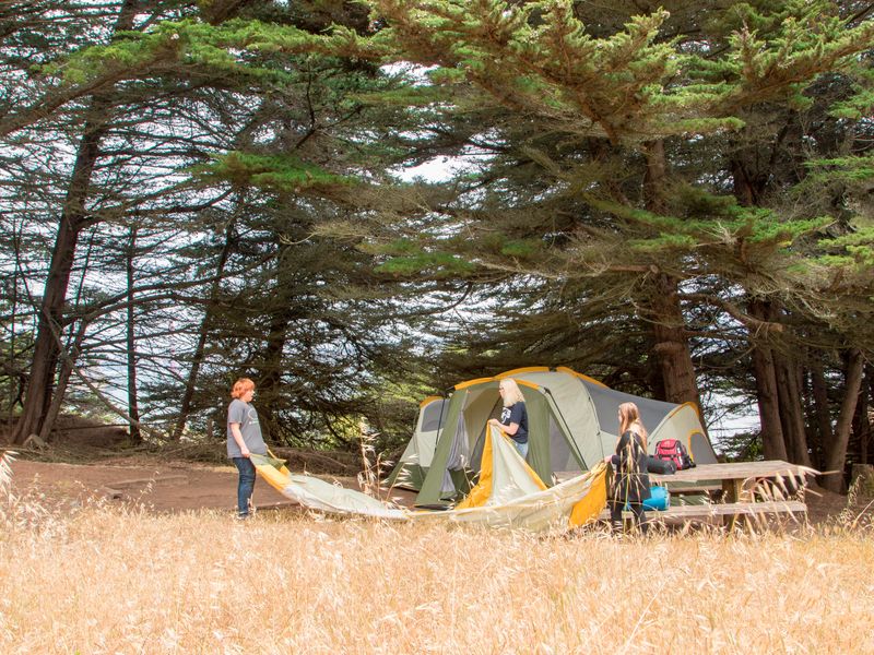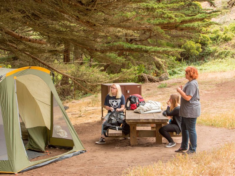 Bicentennial Campground is the most accessible campground in the Golden Gate National Recreation Area's Marin Headlands, located just 200 yards down a moderately steep, packed dirt trail from the parking area near Battery Wallace. The campground features three walk-in tent sites nestled within a secluded cypress grove, offering stunning views of the Golden Gate Bridge and the city of San Francisco. Each campsite accommodates up to three guests and includes a picnic table, barbecue grill, and food locker to protect against wildlife including raccoons, deer, coyotes, and bobcats that frequent the area. The campground is ideal for those wanting to camp near the city while enjoying the natural beauty of the coastal headlands. The Marin Headlands offers excellent hiking opportunities with many trails featuring scenic views nearby. Rodeo Beach is approximately 1.5 miles away, and the historic Point Bonita Lighthouse and Nike Missile Site are within walking distance. Campers should note there is no water available at the campground, so all drinking, cooking, and cleaning water must be packed in. Water is available at public restrooms on Field Road, approximately one mile away at the Marin Headlands Visitor Center. The campground has a portable restroom on-site, with a pit toilet located 0.5 miles away at Bicentennial Picnic Area. Due to the walk-in nature, many campers use carts or wagons to transport supplies from their vehicles.