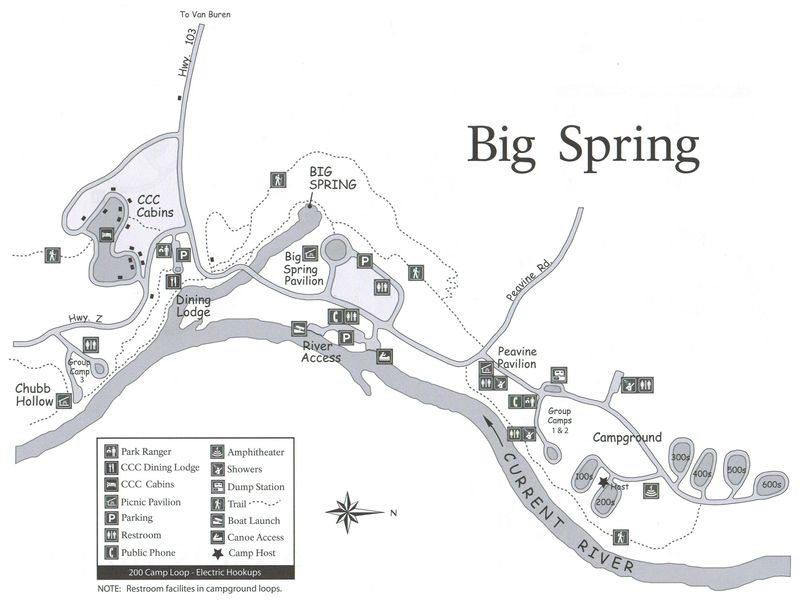 Big Spring Campground is located four miles south of Van Buren, Missouri. From Van Buren, turn south on Missouri Highway 103 from State Highway 60 and continue south for four miles to the Big Spring Unit. The campground is located northeast of the spring, across the large field.