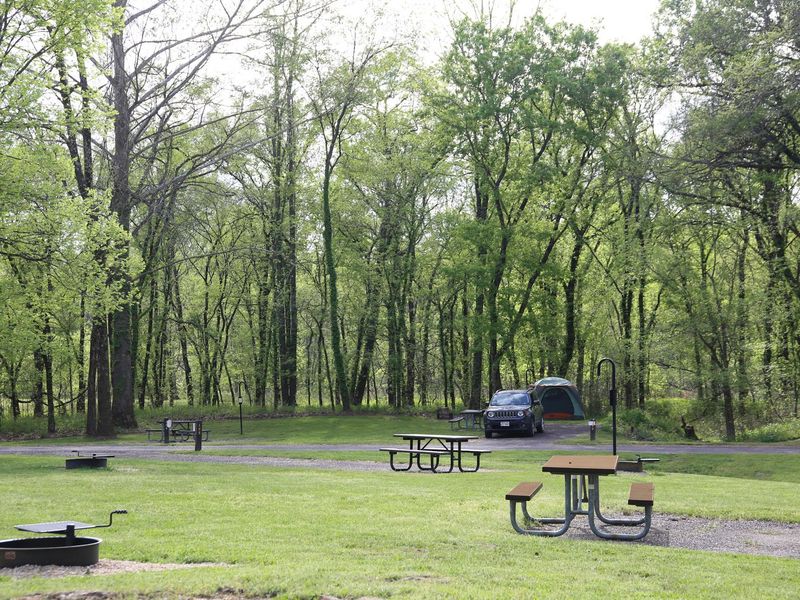 Big Spring Campground sits in the heart of Ozark National Scenic Riverways, America's first national park area designated to protect a wild river system. Located just south of Van Buren, Missouri, the campground offers 123 sites with both electric and non-electric options, all positioned within easy walking distance of Big Spring and the Current River. The campground provides a variety of sunny and shaded sites, making it an ideal base camp for exploring the region year-round. The Current River flows past the campground, providing excellent opportunities for canoeing, kayaking, tubing, swimming, and fishing along over 130 miles of protected waterways. Big Spring itself produces an astounding 280 million gallons of water daily, making it the largest freshwater spring in North America and a spectacular natural attraction. Several hiking and horseback riding trails crisscross the area, including the Alley Overlook Trail, Chubb Hollow Trail, Ozark Trail, Cave Spring Trail, and Big Springs Trail. The campground features modern amenities including flush toilets, hot showers year-round, potable water during warmer months, a dump station, and trash collection. The surrounding Ozark forest showcases White oak and Shortleaf pine, Missouri's only native pine species, along with Sycamore, Cottonwood, and River birch along the waterways. Nearby attractions include Round Spring Cave with ranger-guided tours during summer, and the historic Alley Mill and Alley Spring. Canoe and kayak rentals and outfitters are available in the area.