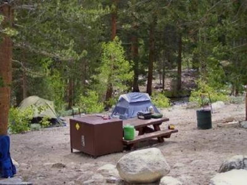 Bishop Park Group campground offers families, friends, and special interest groups a serene setting along the North Fork of Bishop Creek in the Eastern Sierra. Located at approximately 7,500 feet elevation in Inyo National Forest, this tent-only group site accommodates up to 25 people with parking for 8 vehicles maximum. The level, dirt-surfaced campsites border the creek, allowing anglers to fish from the comfort of their campsite for stocked rainbow, brown, brook, and Alpers trout. Similar fishing opportunities exist just upstream in Intake Lake II. The campground is shaded by aspens, cottonwoods, Jeffrey pines, and lodgepole pines, providing a cool retreat during summer months. Each group site includes picnic tables, fire rings with cooking grills, and two bear-proof food storage lockers. Flush toilets and hand-pump drinking water are available. The area is frequented by bears, and all food must be secured in provided containers when not attended. Bishop Park Group serves as an ideal base for exploring the Bishop Creek area and accessing John Muir Wilderness trailheads. Popular activities include horseback riding, wildlife viewing, hiking to nearby glaciers and alpine lakes, and backcountry fishing. The campground is located near the communities of Aspendell and Lake Sabrina, with a nearby resort providing limited groceries, fishing supplies, and internet access. RVs and trailers are not suitable for this site due to the tent-only configuration and limited parking.