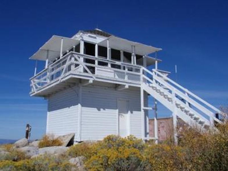 Black Mountain Lookout is a historic fire lookout tower constructed in 1934 by the Civilian Conservation Corps, representing an excellent example of CCC architecture. This C-3-type lookout is situated on a single-story 10-foot tower at 7,161 feet elevation on the eastern edge of the Beckwourth Ranger District in Plumas National Forest. The lookout offers striking 360-degree views of Honey Lake to the north and Last Chance Creek to the south. The cabin comfortably sleeps four people, with camping space available outside for a maximum occupancy of eight visitors. The site includes a picnic table and vault toilet, but no potable water is available. Guests must bring their own water, bedding, and pack out all garbage. Pets are allowed at the site. The lookout is accessed via dirt roads requiring high clearance vehicles, located 10 miles from Highway 395 near Milford. Popular activities include hiking, birding, stargazing, and wildlife viewing. The area is home to diverse wildlife including deer, coyotes, bald eagles, and osprey. Frenchman Lake, popular for swimming, water skiing, fishing, and camping, is within a 30-minute drive.