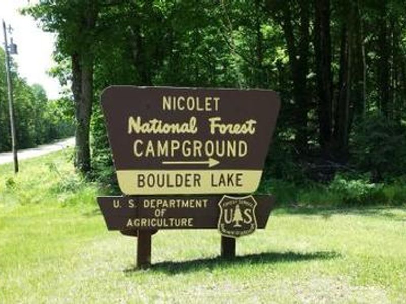 Boulder Lake Campground is located on the southern end of 362-acre Boulder Lake in the Lakewood-Laona District of Chequamegon-Nicolet National Forest. As the forest's largest campground, it features 89 single-family sites and 10 group sites nestled in a stand of young hardwoods, with some campsites situated along the water's edge and others positioned further back for a quieter experience. The campground offers both rustic and modern amenities to suit different camping preferences. Electric hookups are available at sites 9-16 and 40-54, and the facility includes three shower buildings, flush toilets, vault toilets, hand pumps, and an RV dump station. Many sites can accommodate RVs up to 30 feet or longer, and seven group sites feature pull-through access for rigs 45 feet or more. All group sites are reservable, with six sites for small groups up to 16 people and four sites for large groups up to 30 people. Boulder Lake provides excellent recreational opportunities including power boating, water skiing, fishing, and swimming from a designated beach area. The 362-acre spring-fed lake is stocked with walleye, northern pike, bass, and panfish. A paved boat ramp with parking for 16-20 vehicles provides lake access, and the ramp and parking area are plowed during winter for ice fishing access. The campground features a hiking trail with a wooden boardwalk that explores bog vegetation and glacial boulders, with multiple access points from within the campground. Nearby streams offer trout fishing, and the Wolf River provides whitewater rafting and canoeing opportunities. An amphitheater hosts occasional educational programs.