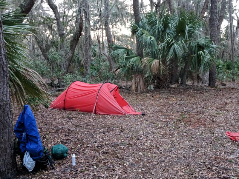 Brickhill Bluff Wilderness Campsite offers a true backcountry experience in Cumberland Island's designated wilderness on the northern part of the island. Located 10.5 miles north of the Sea Camp ferry dock, this primitive campsite requires significant planning and self-sufficiency. The site can be accessed by hiking from the Sea Camp dock, paddling by kayak, or from the Plum Orchard dock if arriving by private boat. With no amenities beyond a pump well providing non-potable water that must be treated, campers must be prepared to pack in all supplies and pack out all trash. The wilderness camping experience at Brickhill Bluff requires adherence to Leave No Trace principles. All food and trash must be stored or hung to protect against raccoons. Fires are strictly prohibited in the wilderness area, though camp stoves are permitted for cooking. The site accommodates up to 6 people per permit, with a maximum stay of 7 consecutive nights. Ferry access from the mainland operates on a limited winter schedule with no service on Tuesdays and Wednesdays from December through February. Campers are responsible for transporting all gear from the dock without wheeled carts or coolers.