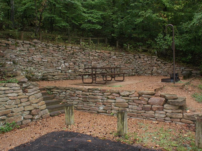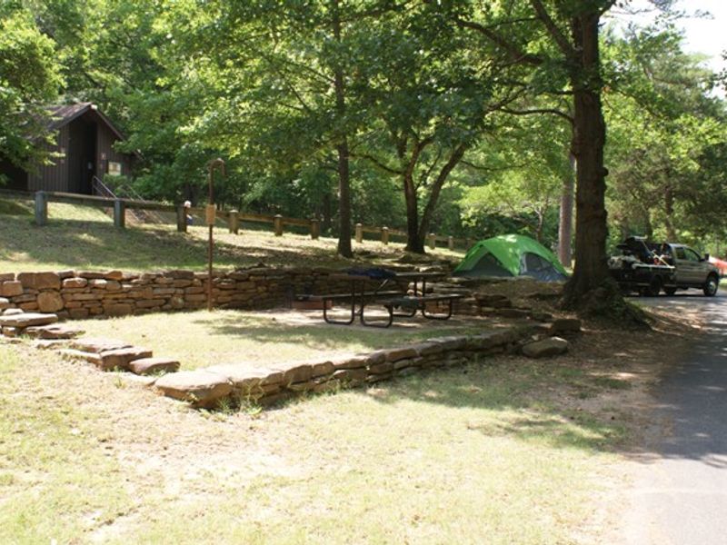 Buffalo Point Campground is the park's largest and most developed camping facility, offering 108 total sites including 82 drive-in sites with water and electric hookups and 26 walk-in tent sites. The campground is divided into loops A through E, with loops B, C, and D available for advance reservations through Recreation.gov, while loops A and E operate on a first-come, first-served basis. There are also five group sites available that can accommodate 10 to 25 people. Each site includes a fire grate, picnic table, and lantern hook. During the peak season from March 15 through November 14, the campground provides full amenities including flush restrooms, hot showers, potable water, electrical hookups, and a dump station. Some sites can accommodate large RVs, though loops A and E are more suitable for smaller rigs. Sites A6 and D55 are ADA compliant and available on a first-come, first-served basis. From November 15 to March 14, only B Loop remains open with limited winter camping and a vault toilet, with no water, electric, or other amenities available. Buffalo Point sits along the Buffalo National River, one of the few remaining free-flowing rivers in the lower 48 states. The river runs 135 miles through the Arkansas Ozarks, surrounded by lush hardwood forests and open meadows. The campground provides excellent access for kayaking, canoeing, fishing, and hiking. Nearby trails include the Indian Rockhouse Trail, and the historic Rush zinc mining district is within easy reach. The campground was originally developed as Buffalo River State Park in the 1930s by the Civilian Conservation Corps. Maximum stay is 14 consecutive days.