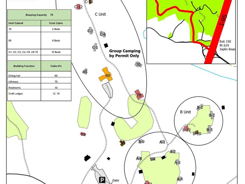 From I-95 north or south, take exit 150. Go west on Joplin Road (VA Route 619) for 0.5 mile. Turn right on Park Entrance Road. After 0.75 mile, turn left onto Scenic Drive. Cabin Camp 3 is on the right after 1 mile. Note: GPS applications may not provide accurate directions to the cabin camps.
