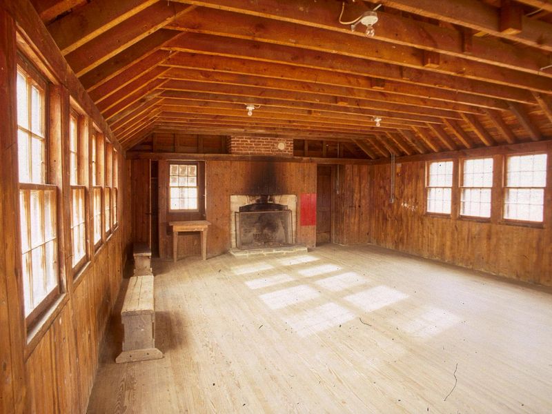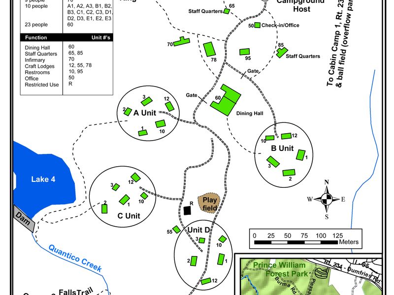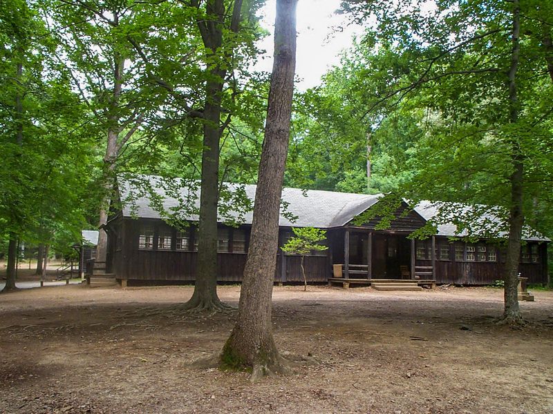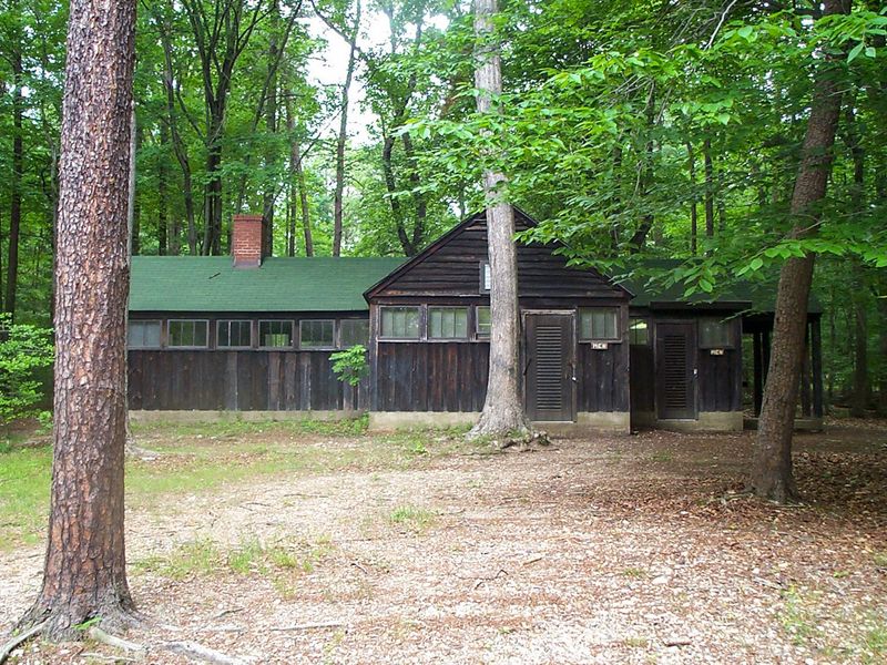 Cabin Camp 4 is one of five historic group cabin camps in Prince William Forest Park, constructed by the Civilian Conservation Corps in the 1930s. The camp has been recently updated with new roofs and windows to preserve these historic structures for future generations. With a capacity of 199 guests, the camp primarily features 10-person sleeping cabins along with a dining hall equipped with a complete kitchen, craft lodges, a fire pit, an infirmary, and a unique theater building/gymnasium that is exclusive to this camp among all the park's cabin facilities. The camp is located on Pleasant Road, which transitions from paved to gravel. The facility offers modern amenities including hot showers year-round, flush toilets, and potable water. The entire camp must be reserved as a single unit at least two weeks in advance through an application process with a $25 application fee. The nightly rate is $750 for the entire facility, not including the $20 per vehicle park entrance fee. Groups must follow quiet hours between 10:00 p.m. and 6:00 a.m., and all camping tents or additional structures are prohibited within the cabin camp area.