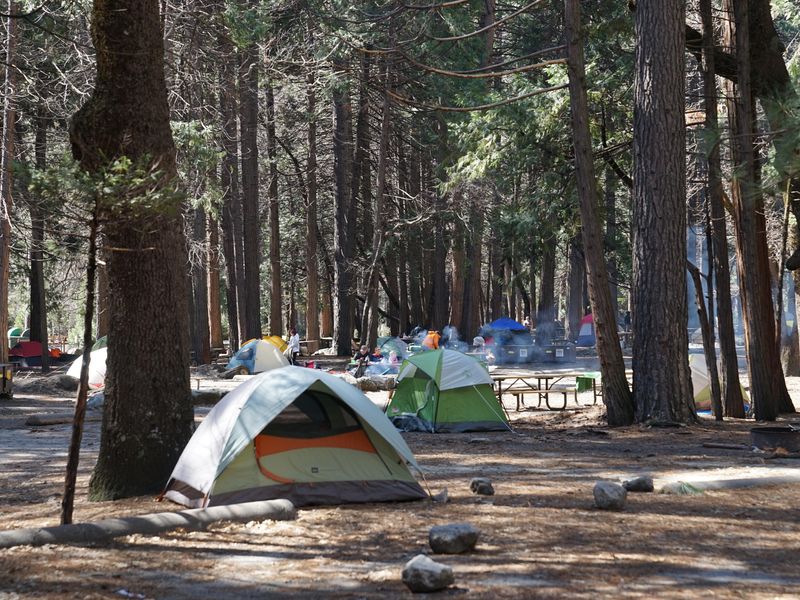 Camp 4 holds a legendary status in Yosemite National Park as the birthplace of modern American rock climbing. Located at 4,000 feet elevation in Yosemite Valley, this walk-in campground sits near the base of iconic granite walls and within walking distance of Yosemite Falls. The campground's unique shared-site system assigns up to six individuals per site, creating a communal atmosphere that has fostered climbing partnerships and friendships for generations. The campground features 61 tent-only sites, though only 25 are open during winter months. Each site includes shared picnic tables, bear-proof food storage lockers (35"D x 43"W x 28"H), and fire rings. Vehicles are never permitted inside the campground; parking is located 100-300 yards away. The sites are mostly level with shade provided by California black oak, ponderosa pine, incense-cedar, and white fir. Camp 4's walk-in nature and proximity to world-class climbing routes on El Capitan and other formations make it a pilgrimage site for climbers from around the globe. The campground sits within easy biking or walking distance of Yosemite Valley Lodge and Yosemite Village, offering convenient access to food services, groceries, and the free Valley shuttle. Restrooms with flush toilets and potable water are centrally located within the campground. Due to its shared sites and close proximity of campsites, Camp 4 is not a quiet campground. The social atmosphere and community spirit are part of its charm, though those seeking solitude may prefer other campgrounds. The Merced River flows nearby, and the campground provides access to Yosemite's extensive trail system, from easy valley walks to challenging backcountry routes.