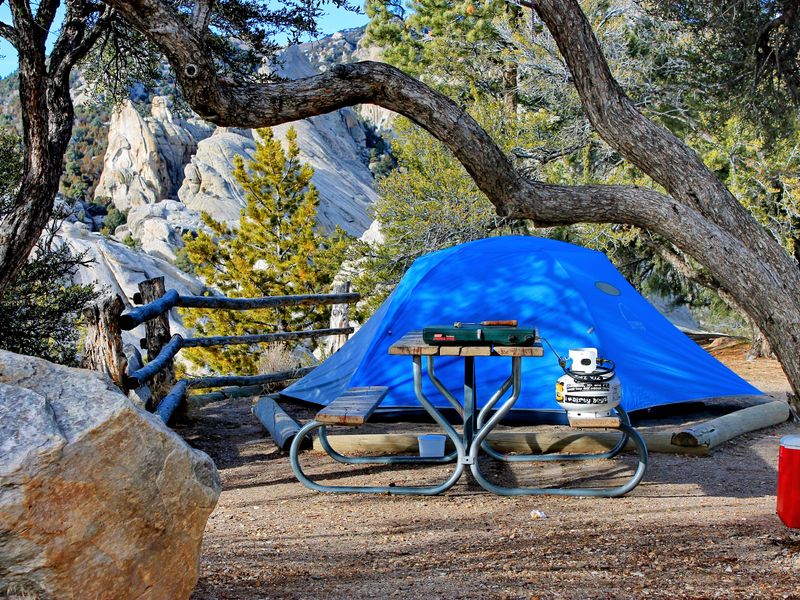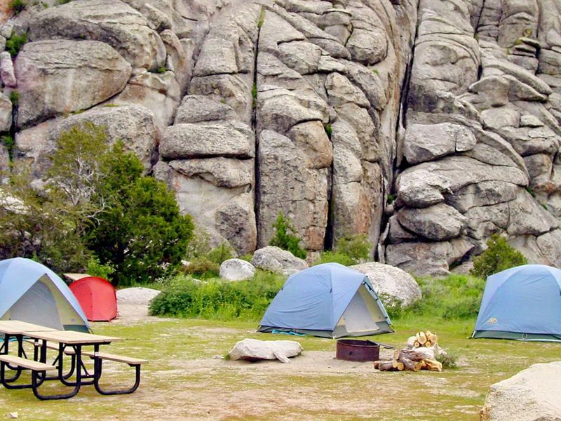 City of Rocks Campground is spread across a 6-mile area within the City of Rocks National Reserve, offering 64 standard campsites and 3 group sites surrounded by impressive granite formations reaching 60 stories tall. Sites are shaded by aspen, juniper, mountain mahogany, and pine, providing a cool retreat beneath the reserve's iconic rock spires. Each standard campsite includes a fire ring with ground grill and picnic table, accommodating up to 8 people, 2 tents, and 2 vehicles per site. The campground is renowned for access to world-class granite climbing with approximately 700 developed routes on the Almo Pluton, considered some of the finest granite-face climbing anywhere. Hiking, mountain biking, horseback riding, and viewing historic California Trail wagon ruts and pioneer inscriptions are popular activities. Winter visitors enjoy snowshoeing and cross-country skiing opportunities. The campground is fairly primitive with gravel roads that can be steep in places. Select sites (5, 7, 12, 13, 15, 20, 33, 34, 35, 46, 47, 57, 63, 64) can accommodate RVs and trailers up to 28 feet. Sites 5, 12, 20, 27, 39, and 63 are the most level and accessible. Larger RVs should consider nearby Smoky Mountain Campground with full hookups. Vault toilets are located throughout the reserve year-round. Water is available seasonally from May through September at select locations and at the visitor center during winter months.