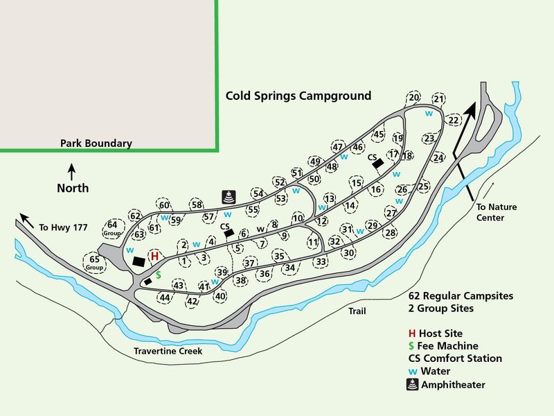 From I-35, take Exit 55 towards Davis, OK. In Davis, drive east on Highway 7 for approximately 8 miles to Sulphur. At the 4-way stop (junction of Highway 7 and Highway 177), turn right onto Highway 177 for 0.2 miles. Take the first left onto NE Perimeter Road and continue until you see the Cold Springs Campground sign on your left.
