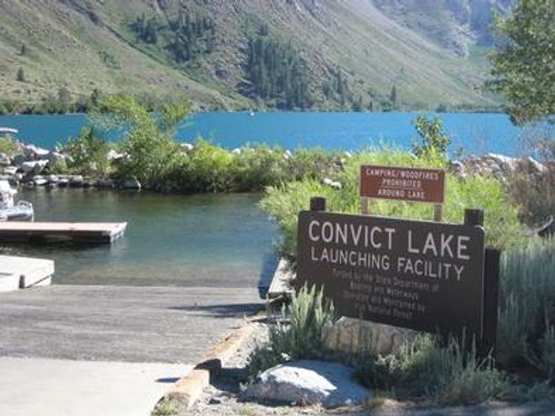 Convict Lake Campground is situated at 7,600 feet elevation along Convict Creek in the Inyo National Forest, approximately 100 yards from Convict Lake. The campground offers 85 sites spread across terrain of shrubs and low vegetation, with groves of aspen and cottonwood trees along the creek. Many sites are flat and suitable for RVs, though no hookups are available. Each site includes a bear-proof locker, picnic table, and fire pit. The eastern Sierra location provides exceptional trout fishing for rainbow and brown trout in both the creek and lake. Power boats are limited to electric motors only on the lake. The 3.5-mile Lake Trail can be accessed directly from the campground, and numerous trails in the nearby John Muir Wilderness offer extensive hiking, mountain biking, and horseback riding opportunities. The area is home to abundant wildlife including black bears, mountain lions, mule deer, and numerous bird species. The campground operates with a reservation system for half the sites through Recreation.gov, while the remaining sites are available first-come, first-served. A dump station is located a quarter-mile from the campground along Convict Lake Road, and showers are available for a fee at the nearby Convict Lake Resort.