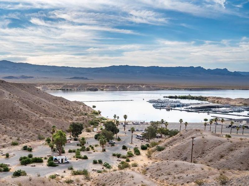 Cottonwood Cove RV Park sits on the shores of Lake Mohave, approximately one hour south of Las Vegas near Searchlight, Nevada. The park features 75 spacious RV sites with full hookups including electric, water, and sewer connections. Paved sites can accommodate large rigs, with some sites allowing up to three vehicles. The resort operates year-round and provides convenient access to Lake Mohave's recreational opportunities. The location offers immediate access to boating, with boat launch ramps, fuel sales, and various watercraft rentals available at the adjacent marina. The resort includes a motel, cafe serving breakfast, lunch, and dinner, and a store with supplies. Sandy beaches are within walking distance, and picnic areas with tables and grills are available throughout the property. The surrounding area features opportunities for hiking along the shoreline and exploring nearby coves. Summer temperatures frequently exceed 100°F from June through August, with May and September averaging around 90°F. October through April brings much cooler weather, with temperatures occasionally dipping to freezing from December through February. The area receives only 4 inches of rain annually. Some sites feature lush vegetation providing shade. Pets are welcome with a maximum of two per site, and sites can accommodate up to eight people.