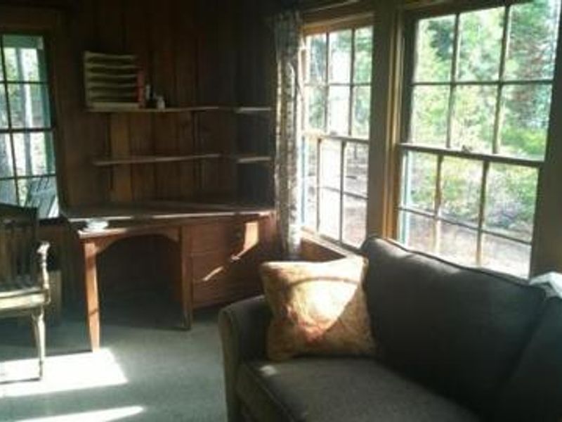 The Crescent Lake Guard Station, built in the early 1930s, is a one bedroom, one bath historic cabin rental on the eastern shore of Crescent Lake in the Deschutes National Forest. Crescent Lake sits in a naturally glaciated basin behind a moraine dam just east of the summit of the Cascade Mountain Range in northern Klamath County, known for its wooded shorelines, sandy beaches, and brilliant blue-green water. The approximately 670-square-foot guard station sits atop a small hill overlooking the lake in an open ponderosa pine stand. Inside, guests will find a full kitchen with refrigerator, stove, and sink, a furnished living room with a couch that folds out to a full bed, an original buffet, a desk, and a gas wood stove heater. The bedroom has a full bed, and the bathroom features a claw foot tub, toilet, and pedestal sink. Outside amenities include a picnic table, fire grill, and horseshoe pit. Hand-pumped drinking water is available on site. The guard station accommodates up to four people with a two-night minimum stay. A boat launch and Crescent Lake Resort are within walking distance, offering food, fishing supplies, and boat rentals. The Diamond Peak Wilderness trail system is accessible nearby. Guests must bring their own linens, bedding, garbage bags, specialized cooking utensils, dish soap, and toiletries. Pets are allowed outside only.