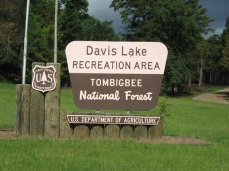 Davis Lake Campground is situated in the rolling hills of Tombigbee National Forest in northeastern Mississippi, surrounding a scenic 200-acre lake. The 26 campsites are located in mixed hardwood and pine forest along the eastern shore, with electric and water hookups available at each site. Many sites have direct lake access with space to anchor boats. The recreation area includes a grassy swimming beach, boat ramp, 16 land fishing piers, 3 wooden piers, 32 picnic sites with tables and grills, one group shelter, 2 bathhouses with flush toilets and showers, and a dump station. Recreational opportunities are abundant. A 2-mile trail wanders along the north edge of the lake connecting to several earthen fishing piers, where anglers pursue largemouth bass, hybrid striped bass, crappie, catfish, and bream. The lake supports both motorized and non-motorized boating. Birders can watch for migratory geese and ducks, along with hawks, herons, bluebirds, and doves. Wildlife including foxes and bobcats inhabit the area. The campground is located within 4 miles of the Natchez Trace Parkway, a scenic 444-mile historic drive. Nearby attractions include the Owl Creek Mounds archaeological site (0.5 miles south), the 12-mile Chickasaw OHV Trail (3 miles away, open April 1 through October 31), the 18-mile Witchdance Horse Trail, and the 43.5-mile Tanglefoot Rails-to-Trails path (5 miles west) running from Houston to New Albany through several Mississippi towns.