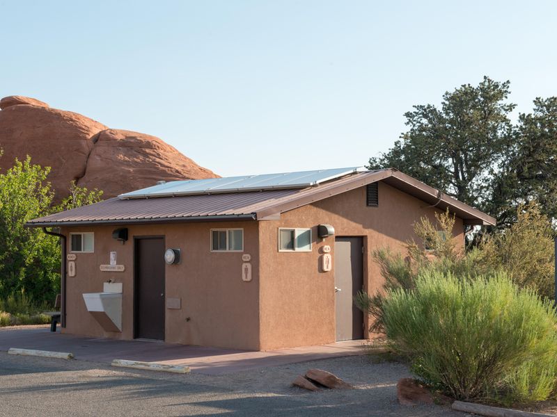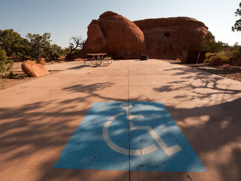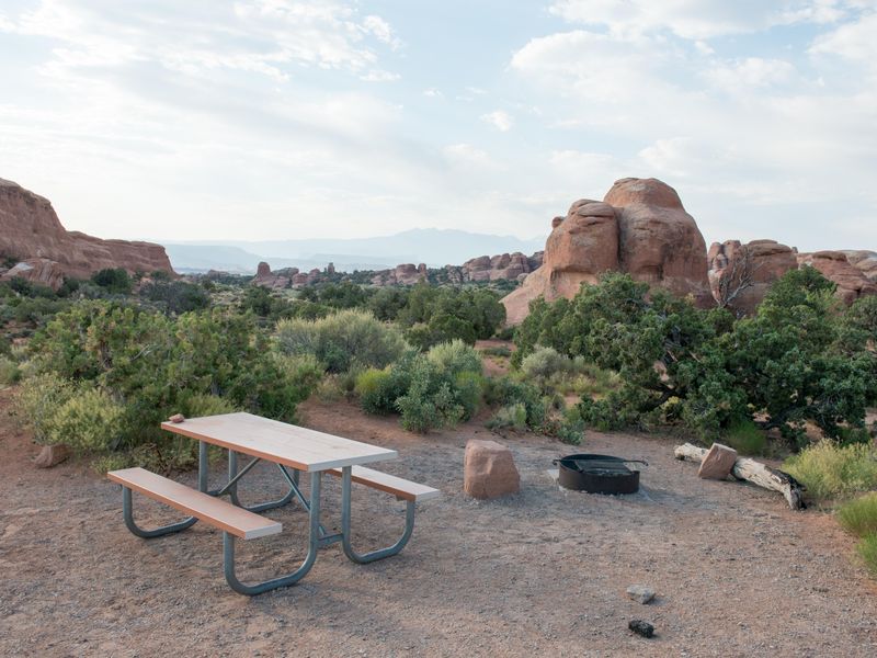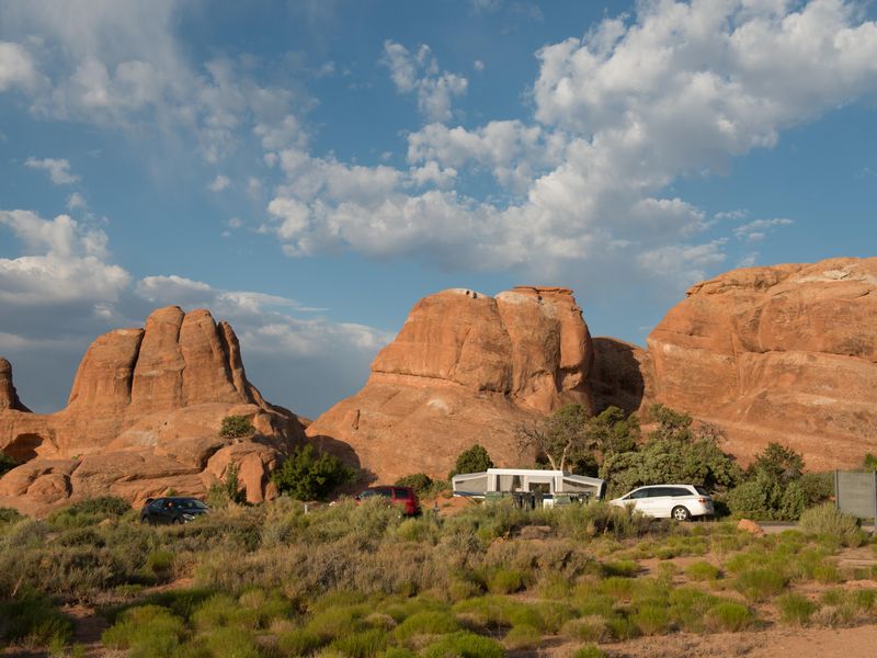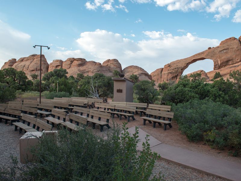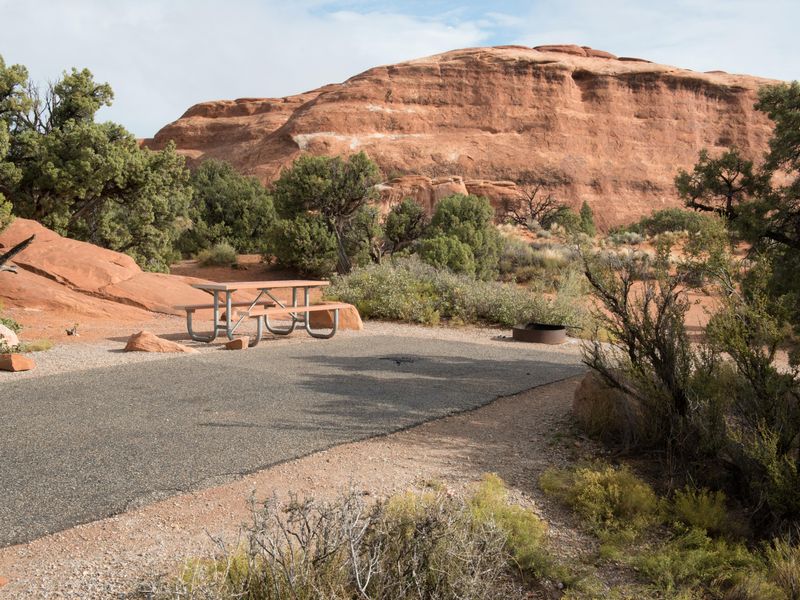 Devils Garden Campground provides the only developed camping option within Arches National Park, located 18 miles from the park entrance and 23 miles from Moab. Situated at approximately 5,200 feet elevation, the campground is nestled among the park's iconic sandstone arches, fins, and slickrock outcroppings, surrounded by stands of Utah juniper and pinyon pine. The campground features 51 campsites, including 2 ADA accessible sites and 2 group sites (Canyon Wren for up to 35 people and Juniper Basin for up to 55 people). Standard sites accommodate up to 10 people and 2 vehicles, with RV and trailer lengths ranging from 20 to 40 feet. No hookups are available. The Broken Arch Trail loop begins directly from the campground, providing convenient access to backcountry exploration. Campers will find both flush and vault toilets year-round, picnic tables, grills, and fire rings at each site. Firewood must be purchased (collecting is prohibited). The campground operates under two seasonal systems: reservable sites from March 1 through October 31 (bookable up to 6 months in advance) and first-come, first-served from November 1 through February 28. During the reservation season, sites typically fill months in advance. The desert environment brings hot summers often exceeding 100°F and cold winters with temperatures dropping to 0-20°F.