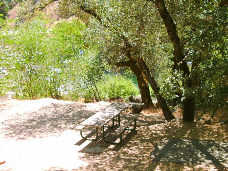 Dry Gulch Campground sits on the north side of the Merced River in the Bass Lake Ranger District at an elevation of 3,400 feet. The small campground features walk-in tent sites on the river, shaded by a grove of pine and oak trees. Most sites are on the river or have direct river access. The remote location makes for a quiet and peaceful camping experience. During the spring and early summer, the Merced River is a popular location for white water rafting and kayaking, with several private companies offering guided rafting trips. The campground is located close to the west entrance of Yosemite National Park, which offers scenic driving, picnicking, hiking, and fishing opportunities. The Sierra National Forest terrain includes rolling, oak-covered foothills, heavily forested middle elevation slopes, and the alpine landscape of the High Sierra. The Bass Lake area is known for its variety of fish and the bald and golden eagles that make their home here.