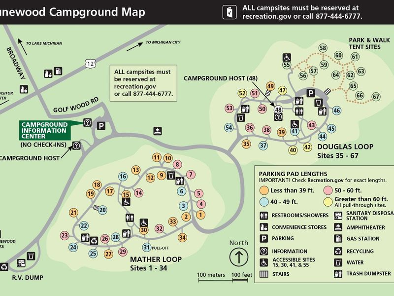 Dunewood Campground is nestled in the wooded interior of Indiana Dunes National Park, offering a peaceful base camp for exploring 15 miles of Lake Michigan shoreline and over 15,000 acres of diverse natural communities. The campground consists of two loops containing 66 campsites: 54 conventional drive-in sites and 12 walk-in sites, with four wheelchair-accessible sites. Each loop features modern restrooms with hot and cold showers. The campground provides easy access to 50 miles of hiking trails that traverse rugged dunes, oak savannas, wetlands, prairies, and forests. Lake View Beach on Lake Michigan is located 1.5 miles north of the campground. The park contains four National Natural Landmarks, including Pinhook Bog and Cowles Bog, along with the historic Bailly Homestead. Convenient amenities include a gas station and convenience store located a quarter mile north at US Highway 12 and Broadway Avenue. The Beverly Shores South Shore Railroad station, also a quarter mile away, provides passenger rail service to Chicago and South Bend. Sites have fire rings and picnic tables, though some sites have limited RV length restrictions.
