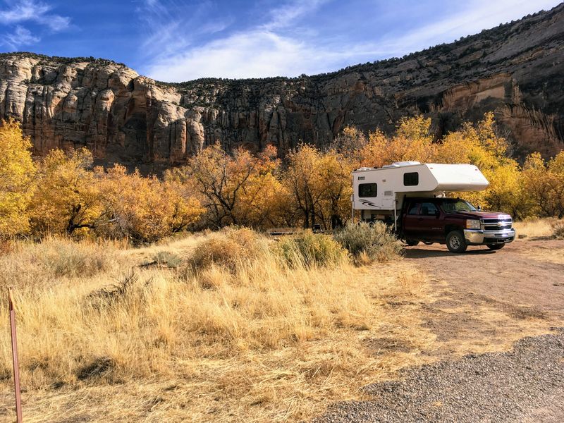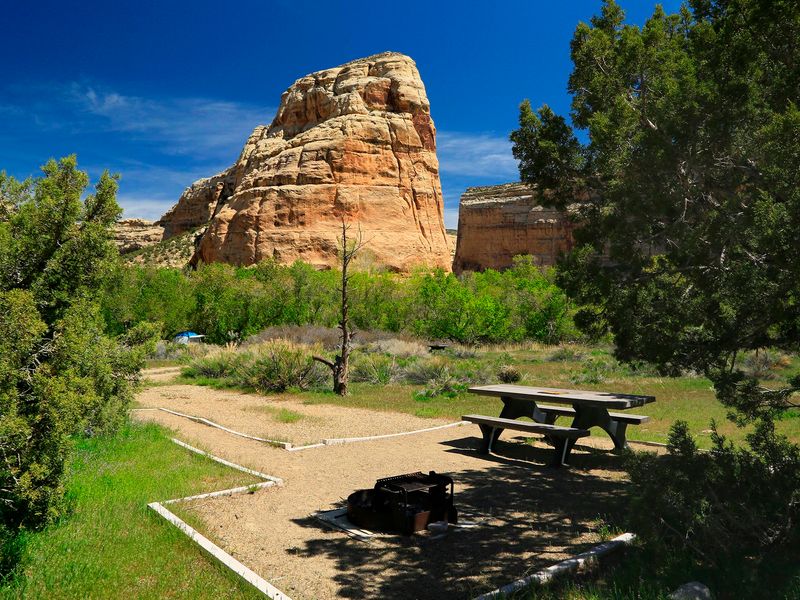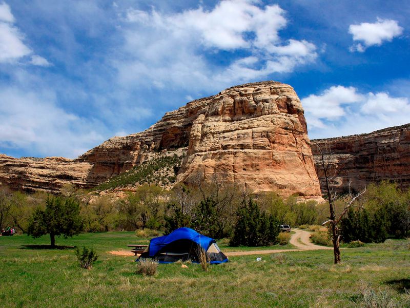 Situated at the confluence area where the Yampa River meets the Green River, Echo Park Campground provides one of the most spectacular and remote camping experiences in Dinosaur National Monument. The campground sits at the base of massive canyon walls with the iconic Steamboat Rock dominating the landscape. Ancient Fremont petroglyphs can be found on the canyon walls, and wildlife including bighorn sheep and mule deer regularly roam through camp. The campground features 17 individual first-come, first-served sites and 1 group site available by reservation. All sites accommodate tents, vans, and truck campers only. RVs and trailers of any size are prohibited due to the extremely challenging access road. The 13-mile Echo Park Road descends from Harpers Corner Road through rugged terrain with deep sand sections, exposed rocks, washouts, and steep grades. High-clearance 4WD vehicles are essential, and the road becomes completely impassable when wet or snowy. While open year-round, the campground operates with seasonal services. Potable water is available during summer months but not in winter. The road receives no winter maintenance, making access difficult or impossible during snow season. Each campsite includes a fire grate and picnic table. Unimproved trails lead to the Yampa-Green confluence and scenic overlooks of the Mitten Park Fault. This is a true backcountry camping experience in one of the most geologically and scenically striking areas of the Colorado Plateau.