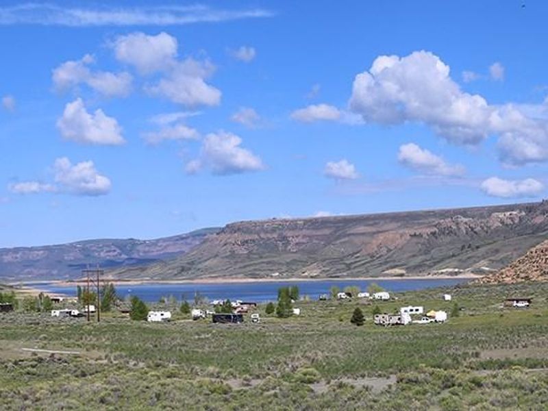 Elk Creek Campground is situated on the north shore of Blue Mesa Reservoir within Curecanti National Recreation Area, 16 miles west of Gunnison along U.S. Highway 50. The campground is a hub for water-based recreation on Colorado's largest body of water, which features 96 miles of shoreline and the largest Kokanee salmon fishery in the United States. Anglers enjoy catching salmon and rainbow trout, while water sports enthusiasts find excellent conditions for windsurfing and water skiing. Swimming is permitted throughout the 20-mile-long reservoir, and birders can spot bald eagles year-round. The campground offers 155 sites total, with 111 reservable sites and 49 first-come, first-served sites. All camping types are accommodated, from tents to large RVs up to 55 feet. Loop D offers the only electric hookups at Curecanti. At an elevation of 7,540 feet, the campground is surrounded by a vast expanse of sagebrush with minimal trees, as the area receives less than 12 inches of rain annually. The campground features paved roads, flush toilets seasonally and vault toilets year-round, and a dump station. Weather varies greatly, with summer temperatures ranging from 50 to 90°F during the day and 40 to 60°F at night, with afternoon thunderstorms and strong winds common.