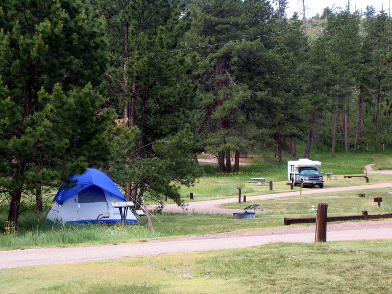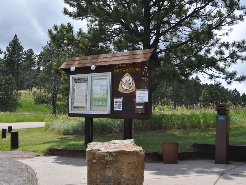 Located 11 miles north of Hot Springs off US Highway 385, approximately 0.5 miles west of the highway. From Rapid City, take SD Highway 79 south 50 miles to US Highway 385, turn right and continue 6 miles north through Hot Springs into the park. Campground entrance is about 0.25 miles north of the visitor center. Do not rely exclusively on GPS. Visitor Center coordinates: N43.55677 W103.47799