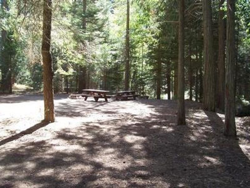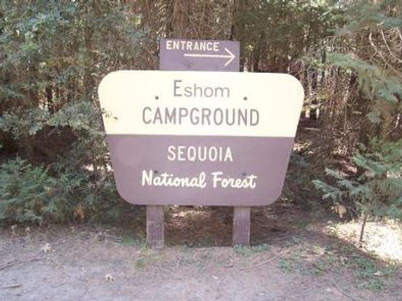 Located in the Giant Sequoia National Monument within Sequoia National Forest's Hume Lake Ranger District, Eshom Campground offers a remote forested camping experience at 4,800 feet elevation. The facility features 23 multi-family sites spread across two distinct sections along Eshom Creek, which runs adjacent to the campground with many sites bordering the water. The west section comprises two loops with more developed amenities, including potable water spigots throughout and sites 2 through 5 designed for slide-ins and tents. An old road open to foot traffic provides creek access. The east section presents a more rustic experience with irregular parking aprons, stone fire rings without grills, and a spur ending in a loop configuration. Both sections feature vault toilets. A fenced pasture accommodates campers with horses. The campground sits approximately 80 miles northeast of Fresno in a heavily forested area of ponderosa pine, cedar, giant sequoias, and other conifers. Black bears, mule deer, squirrels, and numerous bird species inhabit the area. Trails from the campground lead into the magnificent Redwood Mountain and Whitaker Forest groves of giant sequoias. Kings Canyon National Park entrance is just over an hour away. Access requires navigating approximately 9 miles of unpaved county and forest roads with rough conditions, large potholes, and sharp curves. The final approach on FR 14S75 features large berms requiring careful speed management.