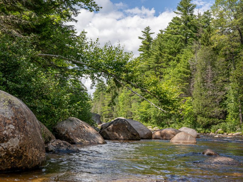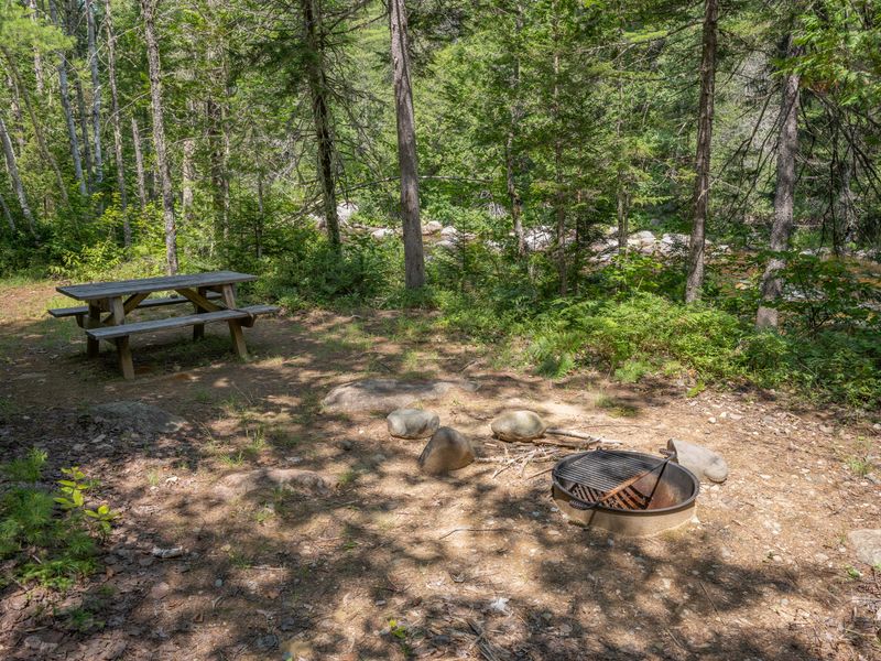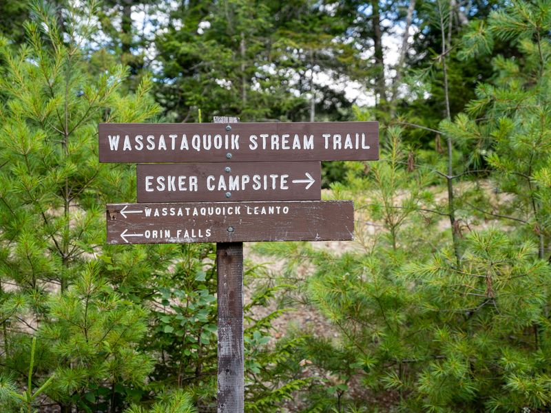 Esker Campsite offers a true backcountry camping experience within Katahdin Woods and Waters National Monument. Located approximately 2.2 miles from the Wassataquoik Gate parking area, this primitive walk-in site requires hikers or bikers to travel along an uneven trail to reach the campsite. The site is situated in a forested setting directly on the bank of Wassataquoik Stream, providing a scenic and secluded camping location. This is a no-fee, primitive campsite with minimal amenities. There are no toilets, potable water, or trash services available. Campers must practice Leave No Trace principles and pack out all trash and waste. The site features a table and designated fire pit. Campfires require a free Maine Forest Service campfire permit, which can be obtained from the Maine Forest Service Northern Region Headquarters in Ashland prior to your visit. Camp stoves are allowed without a permit. Out-of-state firewood is banned to protect against invasive species. The campsite can be reserved through Recreation.gov between Memorial Day weekend and mid-October. Unreserved sites are available first-come, first-served on the day of arrival during the reservation season. Access to the trailhead requires driving approximately 12 miles on Swift Brook Road from Route 11 in Stacyville to Katahdin Loop Road, then approximately 5.5 miles to the Wassataquoik Gate parking area. All roads within the monument are unpaved.