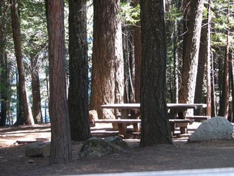 Fashoda Campground occupies a scenic peninsula jutting into the eastern side of Union Valley Reservoir in the Crystal Basin area of Eldorado National Forest. At an elevation of 5,100 feet, this tent-only campground requires campers to walk in from a parking lot above, creating a more intimate camping experience. The campground provides vault toilets, drinking water, showers, and a picnic area. A fee dump station is available at nearby Yellowjacket or Sunset Campgrounds. Union Valley Reservoir spans 25,000 acres and serves as a hub for water-based recreation including swimming, sailing, water skiing, and fishing for rainbow, brown and mackinaw trout and Kokanee salmon. The Union Valley Bike Trail stretches 4.8 miles with a 300-foot elevation gain, connecting campgrounds from Wench Creek to Jones Fork. Two Peaks offers panoramic views of Union Valley and the Crystal Basin. The surrounding Eldorado National Forest is home to remnants of California Gold Rush mining operations from the 1800s. Wildlife in the area includes spotted owls, bobcats, mule deer, and porcupines. Bears are active in the area and proper food storage is required. The campground enforces a 14-day maximum stay per calendar year across the entire forest.