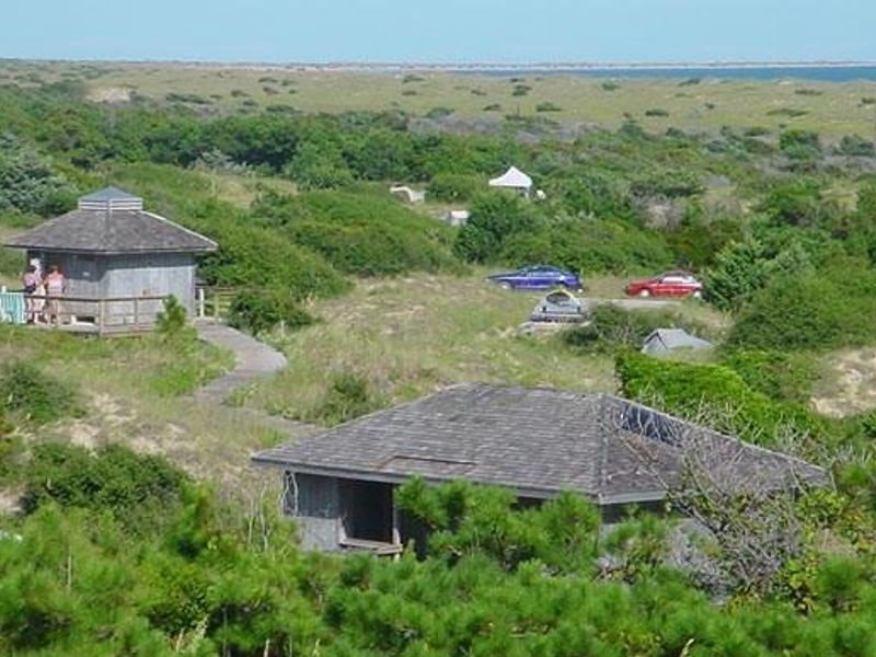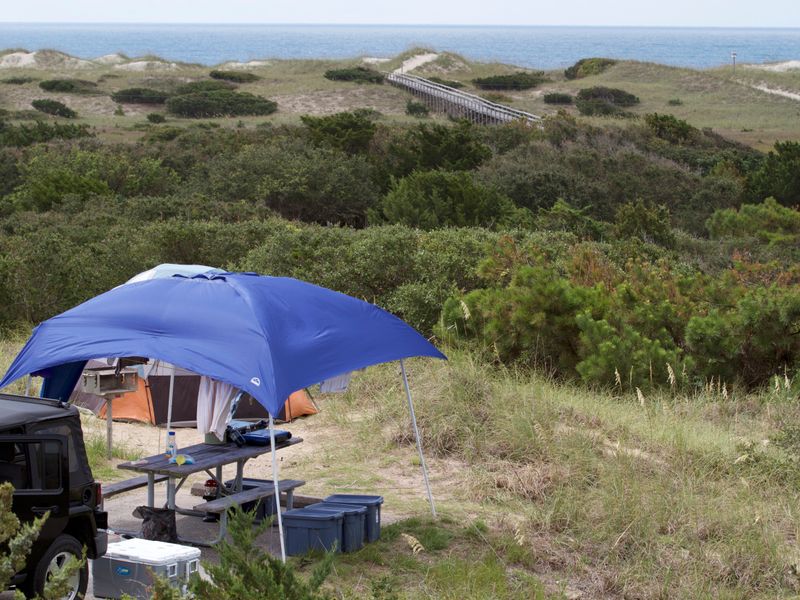 Frisco Campground is situated within Cape Hatteras National Seashore on Hatteras Island, near the village of Frisco on the Outer Banks of North Carolina. With 127 sites, the campground is located west of the Cape Hatteras Lighthouse and features unique rolling topography with elevated dunes that afford ocean views from select campsites. Dense vegetation creates a sense of privacy not found at other campgrounds in the seashore. The campground provides modern amenities including restrooms with flush toilets, potable water, and unheated outdoor showers. Each campsite comes equipped with a paved parking pad, picnic table, and charcoal grill. Wooden boardwalks make it easy for campers to access the beach for surfing, swimming, and fishing. An off-road vehicle ramp at the campground entrance provides beach driving access for those with a Cape Hatteras ORV permit. RVs and trailers up to 40 feet are accommodated, though there are no hookups. The campground is within a short drive of the historic Cape Hatteras Lighthouse, the tallest brick lighthouse in the country, which famously was moved 2,900 feet to its current location in 1999. At night, campers can see the sweeping beacon of the lighthouse from the campground. The location provides access to fishing, beachcombing, biking, kayaking, and other coastal activities typical of the Outer Banks.