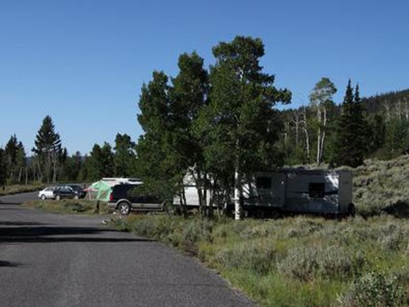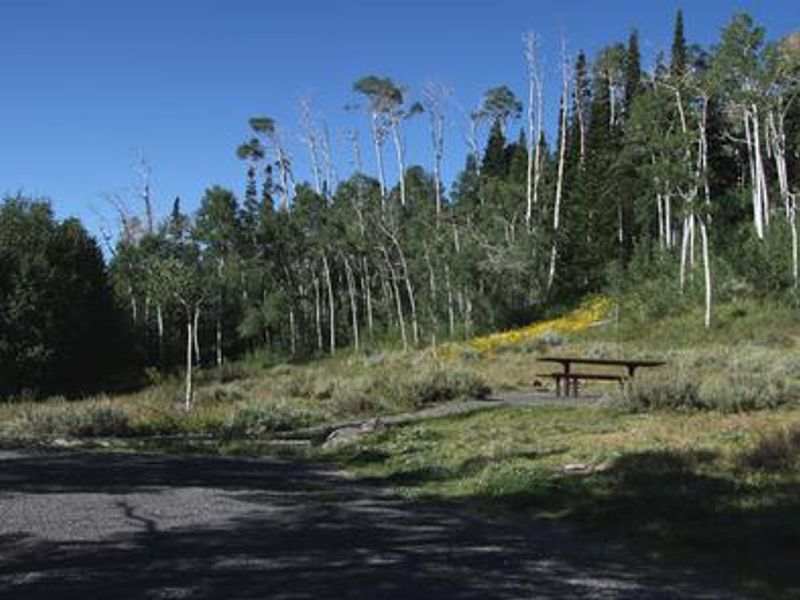 Frying Pan Campground is located on the Fishlake Scenic Byway in central Utah, just 3 miles north of Fish Lake at an elevation of 9,000 feet. The campground sits on a sagebrush-covered hillside above the valley floor with views of the north end of Fish Lake Basin. Aspen trees scattered throughout the campground provide limited shade. Paved roads and parking spurs make access easy for various vehicle types. The campground offers 11 total campsites: 6 are reservable through Recreation.gov (5 single-family sites at $20 per night and 1 group site accommodating up to 100 people and 30 vehicles for $95 per night), while 5 sites are available first-come-first-served. Each single-family site includes one vehicle in the fee, with additional vehicles charged $7.50 per day. Amenities include flush and vault toilets, drinking water from hand pumps during the operating season, picnic tables, and campfire rings. Fish Lake, Utah's largest natural mountain lake covering 2,500 acres, is the main attraction. The lake is renowned for its trophy Mackinaw lake trout weighing 20-40 pounds, plus rainbow trout, splake, perch, and Kokanee salmon. Boating, canoeing, swimming, scuba diving, and fishing are popular activities. The scenic Lakeshore National Recreation Trail extends around the eastern side of the lake, climbing 900 feet in elevation and rewarding hikers with stunning lake views. Johnson Valley Reservoir to the north offers additional fishing opportunities, and the 5-mile Pelican Canyon Trail at nearby Bowery Creek Campground climbs to the 11,633-foot Fish Lake Hightop through meadows and dense forests.