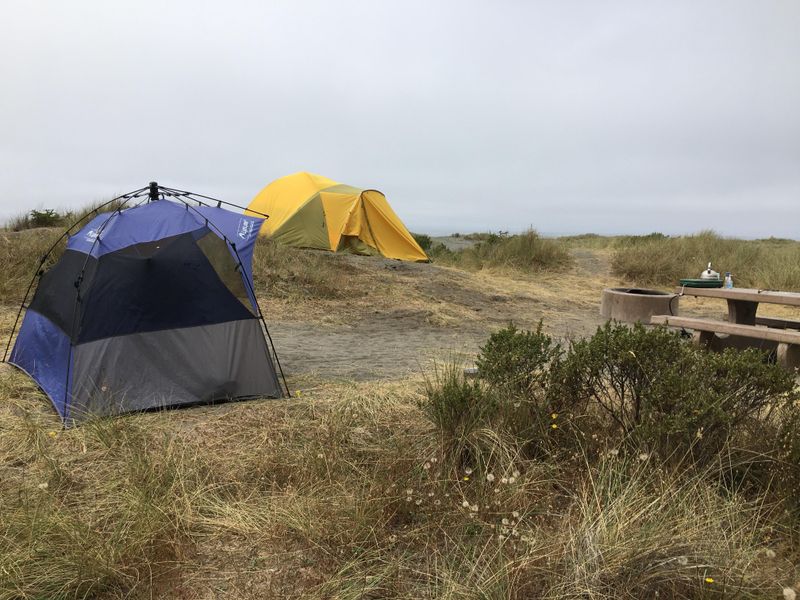 Gold Bluffs Beach Campground provides a unique coastal camping experience within Prairie Creek Redwoods State Park, part of the Redwood National and State Parks complex. Set on an open grassy plain adjacent to a vast, secluded stretch of Pacific beach and beneath redwood-topped bluffs, the campground offers 26 reservable sites plus a hike/bike site for non-motorized visitors. The campground serves as an ideal base for exploring Fern Canyon's lush vertical walls, observing Roosevelt elk herds that graze the coastal prairie, and accessing more than 75 miles of hiking and biking trails through ancient redwood forests. The wild Pacific coastline offers excellent beachcombing opportunities. Access requires navigating Davison Road, a narrow, winding, single-lane dirt and gravel route that extends 10 miles from Highway 101. Due to road conditions, trailers are prohibited and RVs are limited to 24 feet in length and 8 feet in width. The coastal location means cooler temperatures year-round with frequent morning and evening fog. From May 15 to September 15, permits are required for day-use access to Gold Bluffs Beach and Fern Canyon.