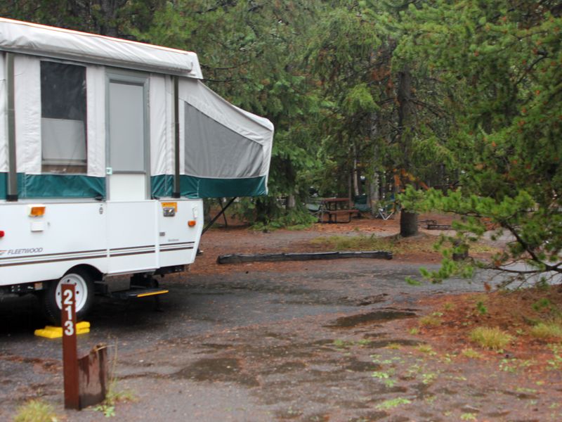 Grant Village Campground is one of Yellowstone's largest campgrounds, situated at 7,800 feet elevation in a lodgepole pine forest on the southwest shore of Yellowstone Lake. The campground offers over 400 regular sites plus 8 group sites, accommodating tents, RVs up to 50 feet, and combination setups. Located just off the Grand Loop Road, it provides easy access from the South Entrance and is positioned near the scenic West Thumb Geyser Basin with its boardwalk system showcasing thermal features along the lakeshore. The campground offers modern amenities including 17 comfort stations with flush toilets and cold running water, dishwashing stations, and a camper services building with coin-operated showers and laundry facilities. Each campsite includes a picnic table and fire grate, with water accessible nearby. While there are no utility hookups at individual sites, an RV dump station is available seasonally. The sites range from partly shady to sunny, and three ADA-accessible sites feature extended picnic tables and raised fire grates. Grant Village itself, located approximately one mile from the campground, provides full services including restaurants, a general store with groceries, gas station with fuel and propane, gift shop, and post office. The National Park Service operates a visitor center, ranger station, and amphitheater with evening programs. The campground is managed by Yellowstone National Park Lodges with advance reservations available.
