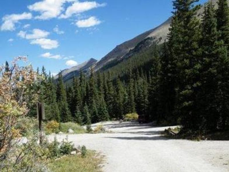 Guanella Pass Campground is situated at 10,900 feet elevation on the Arapaho National Forest, approximately 7 miles south of Georgetown along the historic Guanella Pass Scenic Byway. The byway follows an old wagon route that once linked the mining towns of Georgetown and Grant. The campground is divided into two loops separated by the county road and the South Fork of Clear Creek, offering a total of 18 sites. Eleven sites accommodate RVs with parking spurs ranging from 20 to 45 feet, while seven sites are better suited for tent camping among spruce trees. Most sites are in open terrain, so cold nights should be expected at this high elevation. Each site includes a tent pad, picnic table, fire ring, and charcoal grill. The facility provides hand pumps with potable water, vault toilets, and trash dumpsters, but there are no electric, water, or sewer hookups. Large RVs are not recommended on the narrow byway. Nearby recreation includes trout fishing on the South Fork of Clear Creek and hiking the Silver Dollar Lake Trail, which climbs above treeline to a scenic alpine lake. The historic town of Georgetown and several ghost towns in the region offer additional exploration opportunities.