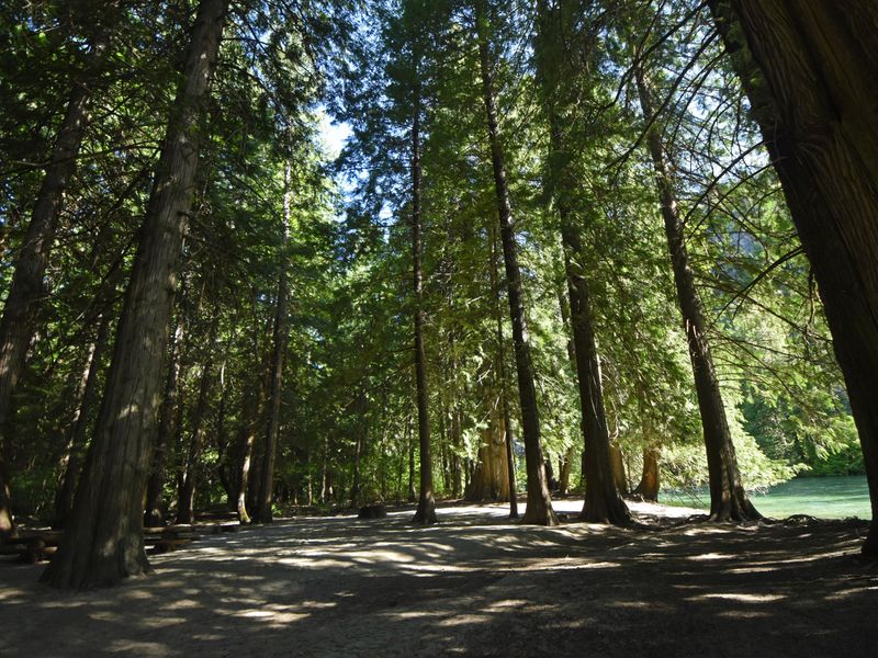 Stehekin is only accessible by boat, plane, or foot with no road connections. From Stehekin Landing, head north on Stehekin Valley Road for 4.5 miles and turn left at Harlequin Bridge. The campground is the first left after crossing the river. From High Bridge, travel 6.5 miles south on Stehekin Valley Road to Company Creek Road.