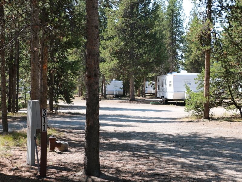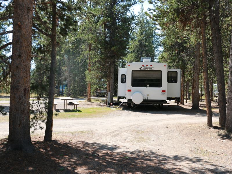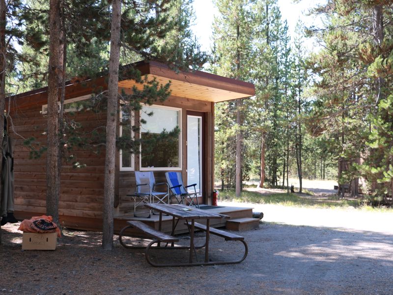 Headwaters Campground at Flagg Ranch sits in a spectacular wooded setting within the John D. Rockefeller, Jr. Memorial Parkway, positioned between Yellowstone National Park (two miles south of the south entrance) and Grand Teton National Park. The campground offers 34 tent sites with gravel parking for up to two vehicles and tent pads for up to two tents. All 97 RV sites are pull-through with full hookups including sewer, water, and 20-, 30-, and 50-amp electric outlets. The 40 camper cabins feature bunk-style beds and lanterns but do not include electricity or private restrooms.