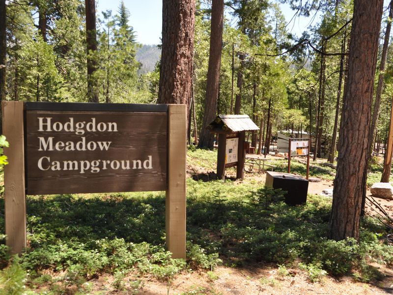 Hodgdon Meadow Campground is located just inside Yosemite National Park's Big Oak Flat Entrance along Highway 120, positioned at 4,875 feet elevation in a mixed conifer forest. The campground features 105 sites nestled among Red fir, incense-cedar, Ponderosa pine, and Lodgepole pine, providing a pleasant combination of sun and shade. Sites accommodate tents, RVs up to 35-40 feet, and trailers up to 27-30 feet, though not every site can fit larger equipment. The campground serves as an excellent base camp for exploring Yosemite, situated 25 miles (45 minutes) from Yosemite Valley. Nearby attractions include the Tuolumne and Merced Groves of Giant Sequoias, accessible via 2.5 to 3-mile roundtrip trails. The White Wolf area on Tioga Road offers additional hiking opportunities. A gas station and small general store are available eight miles away at Crane Flat. Each campsite includes a picnic table, fire ring, and bear-proof food storage locker. The campground provides flush toilets and potable water year-round but has no showers, hookups, or cell phone coverage. A dump station is available in Yosemite Valley. Vibrant wildflowers fill nearby meadows each summer, and the area offers excellent opportunities for wildlife viewing, photography, and accessing Yosemite's famous landmarks including Half Dome, El Capitan, and Yosemite Falls.