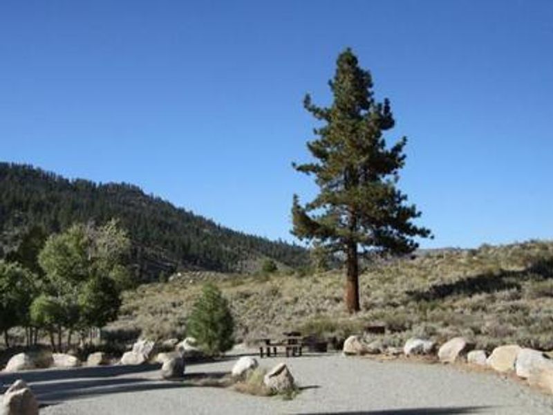 Honeymoon Flat Campground is located 8-10 miles from Bridgeport along Robinson Creek at an elevation of 7,000 feet in the Humboldt-Toiyabe National Forest. The campground is divided into two distinct loops on either side of Twin Lakes Road. The west loop is partially shaded by Jeffrey and lodgepole pines with paved parking spurs at most sites, while the east loop is more open with gravel roads and parking spurs, featuring scattered Jeffrey pines, sagebrush, grasses, and summer wildflowers. The campground provides excellent access to Robinson Creek for rainbow trout fishing, and nearby Upper and Lower Twin Lakes offer additional opportunities for boating, canoeing, and fishing for Kokanee salmon, rainbow, and brown trout. The Robinson Creek Trail and other hiking trails are easily accessible from the campground. The rugged Hoover Wilderness Area can be accessed from the Twin Lakes area for extended backcountry hiking and horseback riding adventures. Educational programs are held at the amphitheater at nearby Robinson Creek South Campground on weekends from July 4 through Labor Day.