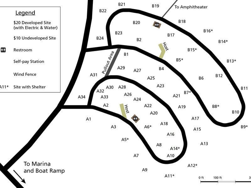Horseshoe Bend Campground is a year-round facility located in Bighorn Canyon National Recreation Area near Lovell, Wyoming. The campground features 68 total sites accommodating both RVs and tents, with options ranging from small RV sites to larger sites that can handle big rigs with vehicles and boats. Twenty-eight sites offer utility hookups with electricity available year-round and water guaranteed from Memorial Day through Labor Day (weather-dependent availability otherwise). Three pull-through sites provide convenient access for larger rigs. All campsites include a fire pit and picnic table. Modern flush toilets are available seasonally, along with an RV dump station and potable water. The campground operates on a mostly first-come, first-served basis, with 5 sites available for reservation online only. A seasonal camp store provides supplies, and a host is on-site during peak season. Recreational opportunities abound with Horseshoe Bend Marina, boat ramp, swim beach, and picnic areas less than a mile from the campground via hiking trail. The campground operates with a 14-night limit within any 28-day period. Fees are charged from mid-April through October, with free camping during the off-season (late October through mid-April) when utilities are not available.