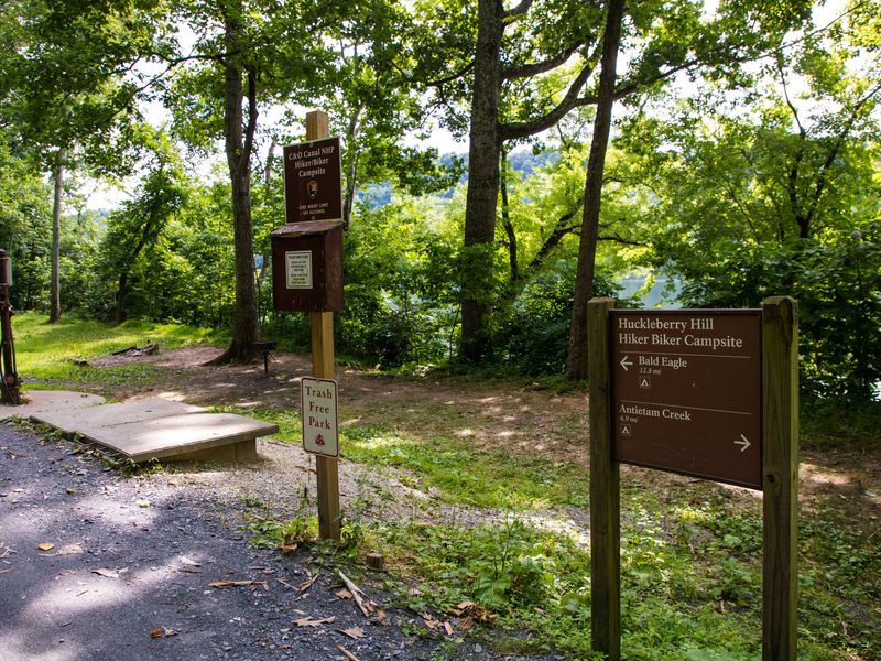 Huckleberry Hill Hiker-Biker Campsite is a primitive camping area located at mile 62.0 along the historic Chesapeake and Ohio Canal towpath. Part of a network of hiker-biker campsites spaced approximately every 5 to 7 miles along the canal, this remote site is accessible only to those traveling by foot, bicycle, or horseback. The campsite provides basic amenities including a chemical toilet, picnic table, and grill. Non-potable water is available from mid-April to mid-November, but it must be filtered, chemically treated, or boiled before use. Water is shut off from mid-November to mid-April each year. No fee or reservation is required, and the site operates on a first-come, first-served basis with a one-night stay limit. Campers should be prepared for a primitive experience, bringing all necessary supplies including drinking water during the winter months. Fires are restricted to provided grills and fire rings, or portable grills positioned off the ground. All coals must be extinguished and removed from the park. The C&O Canal towpath offers a flat, scenic route through Maryland's historic canal corridor, making this an ideal stop for long-distance cyclists and hikers exploring the 184.5-mile trail.