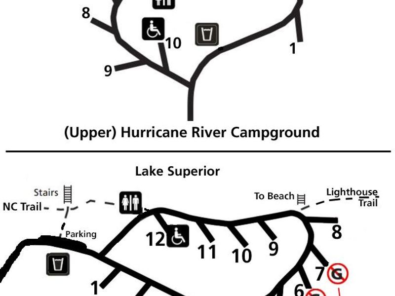Hurricane River Campground sits within Pictured Rocks National Lakeshore, 12 miles west of Grand Marais on County Road H-58. The campground features 21 reservable sites divided between two distinct loops. The lower loop contains 11 sites and serves as the trailhead for the Au Sable Light Station, a 1.5-mile walk along the North Country Trail featuring views of Lake Superior, historic shipwreck remains, and Jacobsville sandstone formations. The upper loop offers 10 sites nestled in northern Michigan hardwood forest, providing a more secluded woodland camping experience. Both loops include one wheelchair-accessible campsite and several generator-free sites for those seeking a quieter experience. Each site includes a picnic table, fire ring with grill grate, and tent pad. The campground provides seasonal potable water and vault toilets but no hookups, showers, or electric service. Cell phone reception is typically unavailable, making this an ideal location to disconnect. The rustic campground features dirt camping pads and pathways. Due to limited turning radius and parking site lengths, the National Park Service recommends single vehicles no longer than 36 feet and combined vehicle/trailer lengths no more than 42 feet. All camping requires advance reservations through Recreation.gov.