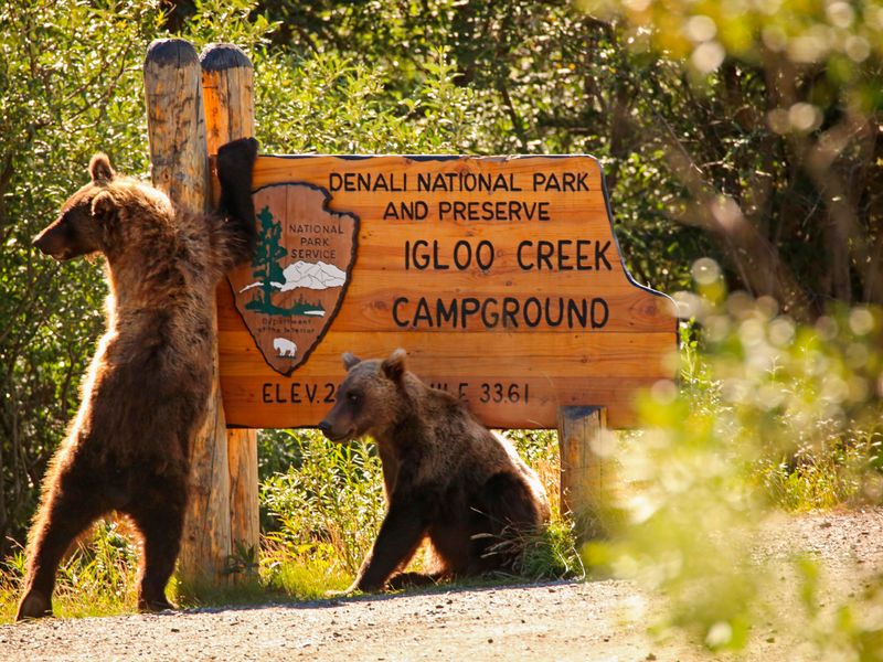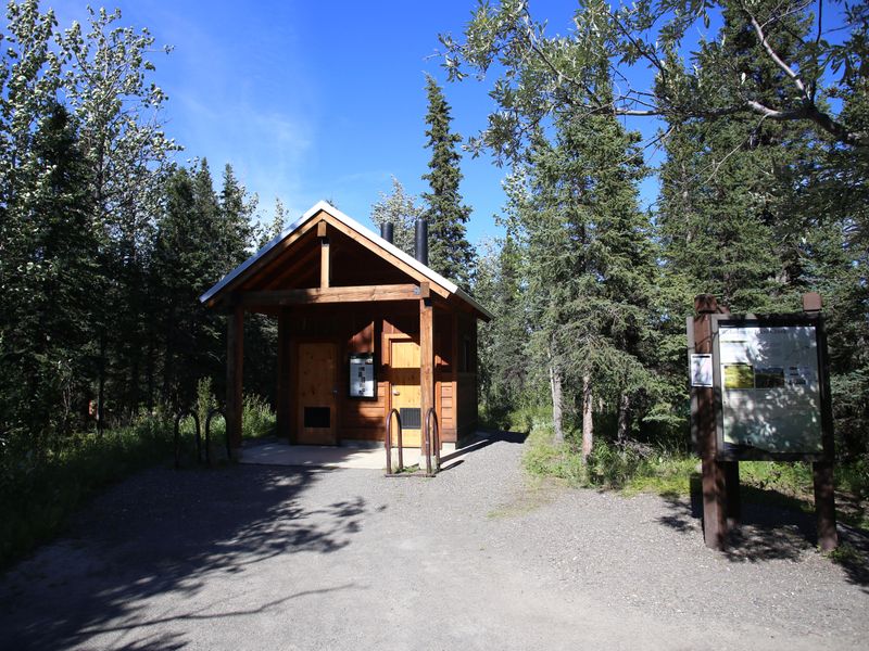 Igloo Creek Campground sits at mile 35 on the Denali Park Road, offering one of the most intimate camping experiences in the park with only 7 tent-only sites. This remote location is accessible exclusively by camper bus, creating a vehicle-free environment perfect for those seeking solitude in Alaska's wilderness. The campground is nestled in Igloo Forest with the bus stop just a short walk from the campsites. Facilities are intentionally minimal to preserve the wilderness character. The campground provides vault toilets that are wheelchair accessible, bear-proof food storage lockers, and seasonal trash collection. No potable water is available on-site, so campers must bring adequate supplies or be prepared to filter water from natural sources. Open fires are prohibited to protect the environment; campers must use portable camp stoves for cooking. Each site accommodates up to three tents and eight people, with stays limited to 14 total nights per summer. Five sites can be reserved in advance through the park's reservation system, while two sites are available first-come, first-served at Riley Creek Mercantile or Denali Bus Depot. The path from the campground to the bus stop features compacted gravel suitable for wheelchairs. Wildlife viewing opportunities abound in this area, with possibilities of spotting moose, bears, and Dall sheep in the surrounding landscape.