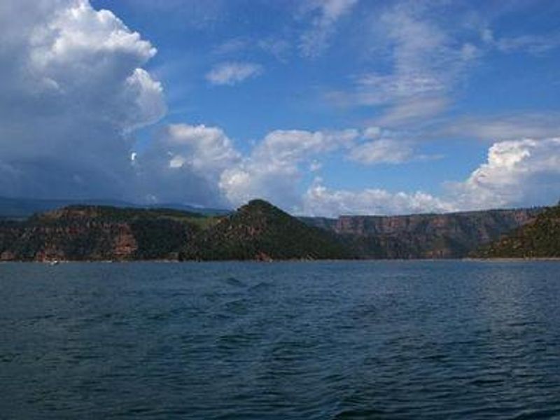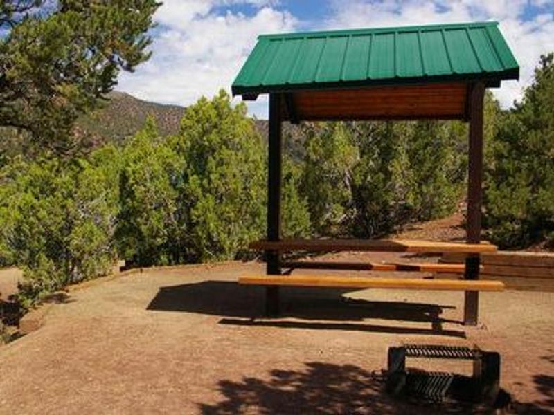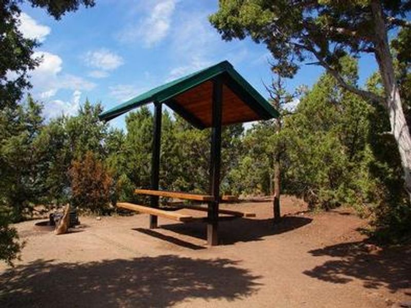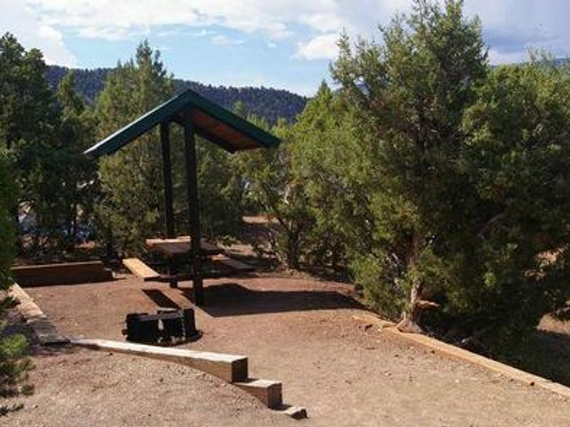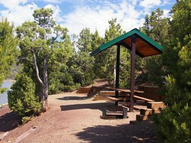 Jarvies Family Boat-In Campground is located on Flaming Gorge Reservoir in Jarvies Canyon at 6,040 feet elevation within Ashley National Forest. The campground is accessible exclusively by boat, with the nearest boat ramps at Cedar Springs Marina and Mustang Ridge Marina, each approximately 20 minutes across the water. Boats must not exceed 30 feet in length. The campground features 8 single-family sites set among dense stands of juniper and pinyon pine on a hillside overlooking the reservoir. While the vegetation provides good privacy between sites, shade is limited. Most campsites offer partial views of the reservoir and its distinctive red cliffs. Each site is equipped with a picnic shelter, table, tent pad, and fire ring with grill. A private dock is located down a short hill on the shoreline, providing easy access to the water for boating, water skiing, fishing, and swimming. A hiking trail passes through the campground. Campers must bring their own drinking water as none is provided. All trash must be packed out. One vault toilet serves the campground. The path from the boat dock to the campground does not meet accessibility standards and some visitors may require assistance. Firewood can be purchased at Cedar Springs or Deer Run. Showers are available at Deer Run and Mustang Ridge for campers with proof of camping registration. Check-in begins at 2 PM and checkout is by 11 AM. Reservations are strongly recommended and available through Recreation.gov.