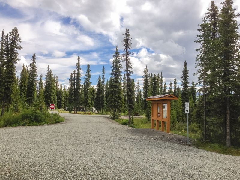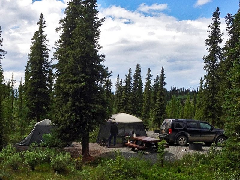Open — Open year-round on a first-come, first-served basis. The Nabesna Road is not plowed in winter, so campsites may be inaccessible due to snow from late September through April. Heavy rain or snow at any time can make the road impassable. Seven-day camping limit per month.