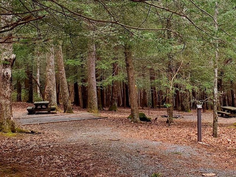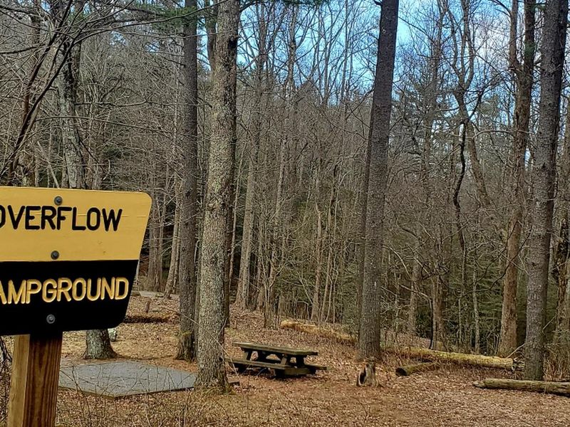 Lake Conasauga Overflow Campground is a small, primitive campground with six non-reservable campsites located near the summit of Grassy Mountain in northwest Georgia. Situated at 3,150 feet elevation, it provides overflow camping for the Lake Conasauga Recreation Area, approximately one mile past the main campground. Each site includes a tent pad, parking spur, picnic table, fire ring, and lantern post. The campground operates on a first-come-first-served basis with payment via the Recreation.gov mobile app or cash/check deposit on-site. The Songbird Management Area sits directly across from the campground, offering a peaceful 2.8-mile interpretive loop trail around a beaver pond with abundant bird species and wildflowers. Half a mile away, visitors can access Lake Conasauga's picnic area, swimming dock, small boat launch (electric motors only), and fishing opportunities for bass, bream, and catfish. Additional trails include the 1-mile Lake Loop Trail and 4-mile Tower Trail. Access requires driving 15+ miles on steep, narrow, winding gravel forest roads through mountainous terrain. The campground sits adjacent to the 45,000-acre Cohutta/Big Frog Wilderness, the largest designated wilderness area east of the Mississippi River, containing 91 miles of backpacking trails. Cell service is limited or nonexistent, and the nearest services are 15 miles away in Crandall, Georgia.