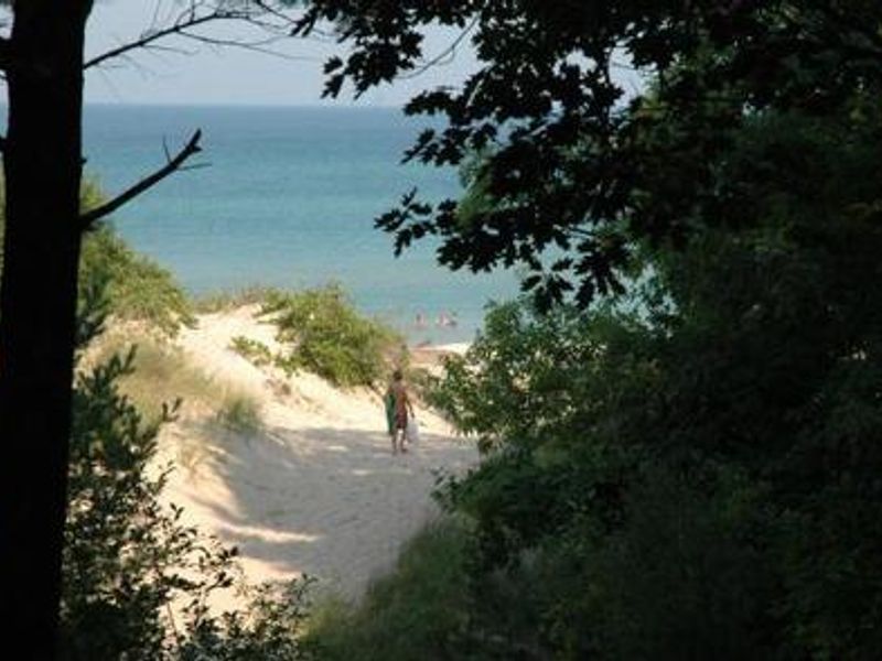 Lake Michigan Recreation Area is a four-loop campground situated on the eastern shore of Lake Michigan between Manistee and Ludington. The campground provides 99 individual campsites across Oak, Orchid, Hemlock, and Violet loops, plus 3 group sites accommodating up to 50 guests each. Two loops operate on a first-come, first-served basis, while others accept reservations through Recreation.gov. The recreation area sits along Porter Creek and offers direct access to a beautiful sandy beach ideal for swimming. A hardwood forest surrounds the campground, creating a scenic backdrop for camping. Amenities include a day-use area with multiple picnic tables, pavilions, a playground, an amphitheater for educational programs, and an overlook deck with views of Lake Michigan. All campsites feature picnic tables and pedestal grills. Recreation opportunities abound with trout fishing in Lake Michigan, hiking the Arrowhead Trail (a loop trail connecting campground to beach), and access to the nearby Nordhouse Dunes Wilderness Area for backpacking. Bird watchers can spot unique species including piping plover and prairie warbler. The campground serves as an excellent base for exploring the Huron-Manistee National Forests' nearly one million acres of public land along Michigan's Lower Peninsula.