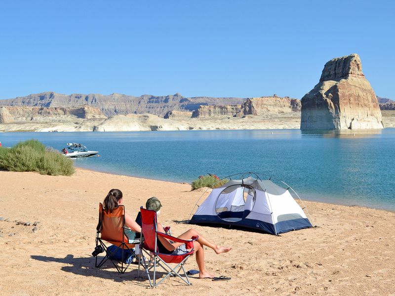 Lone Rock Beach Primitive Camping Area provides a unique camping experience on the sandy shores of Lake Powell within Glen Canyon National Recreation Area. Located just north of the Arizona-Utah state line off Highway 89, this primitive camping area features no designated campsites, allowing campers to set up anywhere on the beach or in the dunes. The area is popular with RV and tent campers alike, though sandy conditions require confidence in driving on sand. The campground operates on a first-come, first-served basis with no reservations accepted. Sites accommodate a maximum of two vehicles per camping spot. Open fires are permitted within a four-foot squared area below the high-water mark where there is no vegetation. The beach also features a designated Off Road Vehicle play area. Glass containers are prohibited, and quiet hours are enforced from 10:00 PM to 6:00 AM. Amenities vary by season. Year-round facilities include vault toilets and a dump station. From approximately mid-April through October, additional services are available including micro-flush toilets, restrooms with wheelchair-accessible comfort stations, outdoor cold showers, and potable water. During winter months, these seasonal facilities close and campers are encouraged to bring their own portable toilet systems and adequate water supplies. The beach itself is not ADA accessible due to its sandy terrain, though an accessible restroom is available at the end of the paved area. Limited cellular service means rangers may not patrol daily, and visitors should be prepared for self-sufficiency. The desert environment ranges from over 100 degrees Fahrenheit in summer to freezing temperatures in winter, with late summer monsoon storms potentially washing out roads.